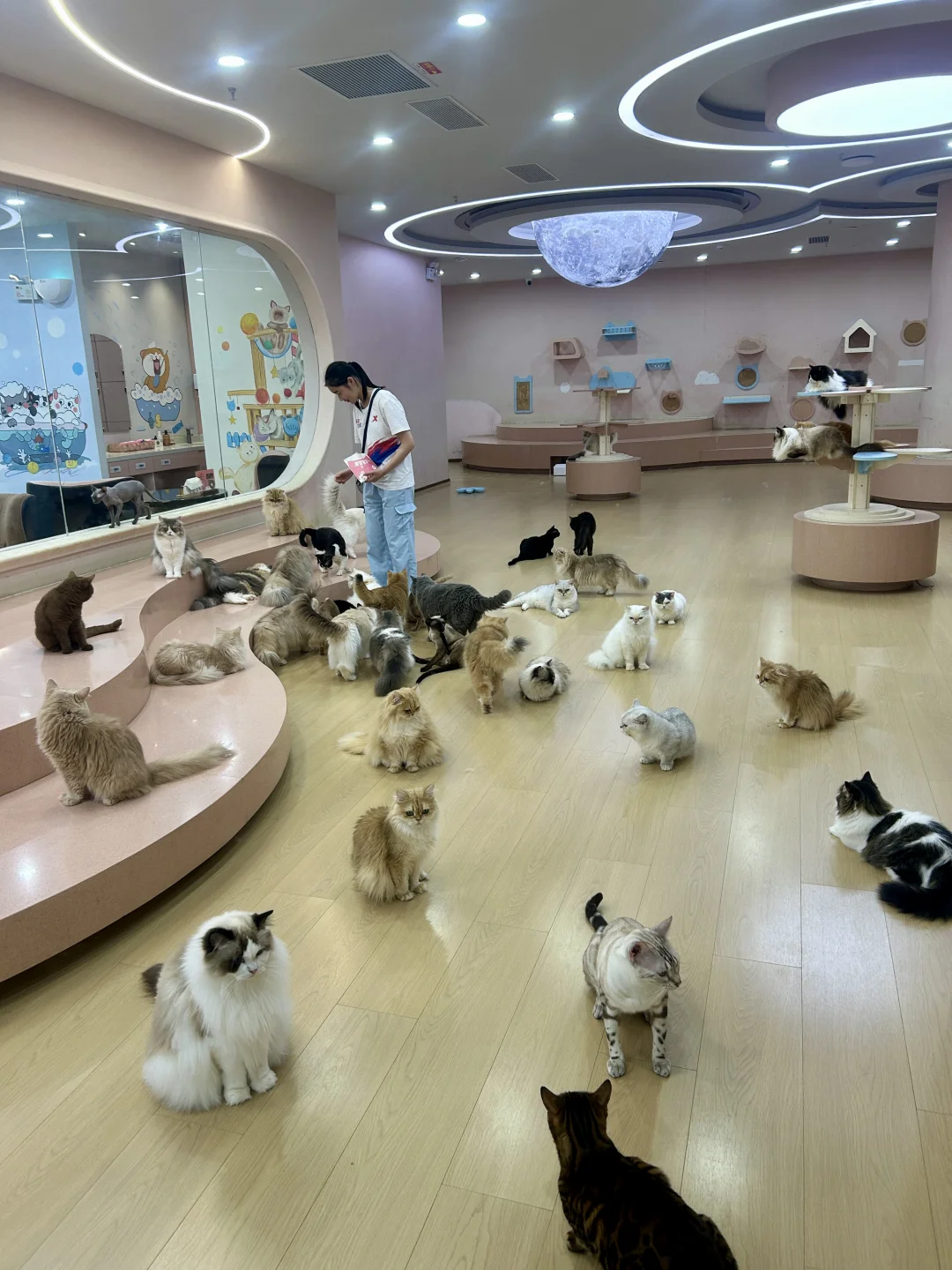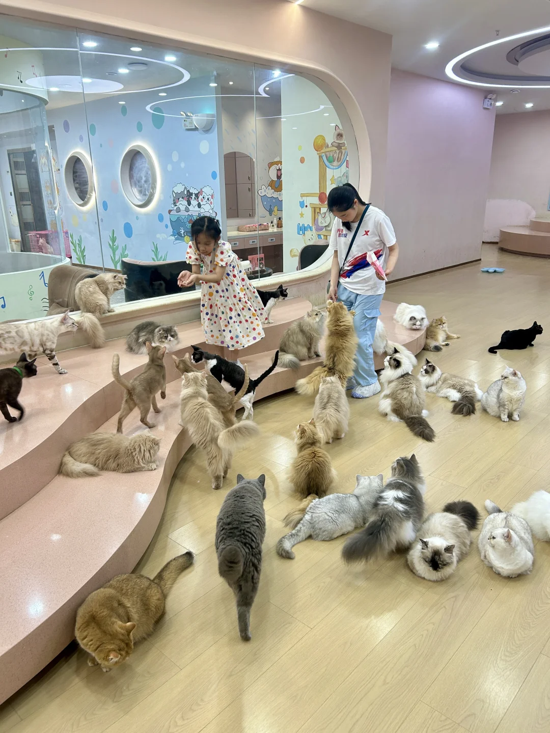 周末带孩子们来体验一家chao大撸猫馆~ 一进门就被震撼住了:chao大的售卖区、各种各样的猫粮、猫猫们都住在大单间、满墙的猫猫奖牌🏅、VIP独立逗猫间、自助储物柜🗄️、chao大用餐区和服务台等等。感觉可以玩一整天!