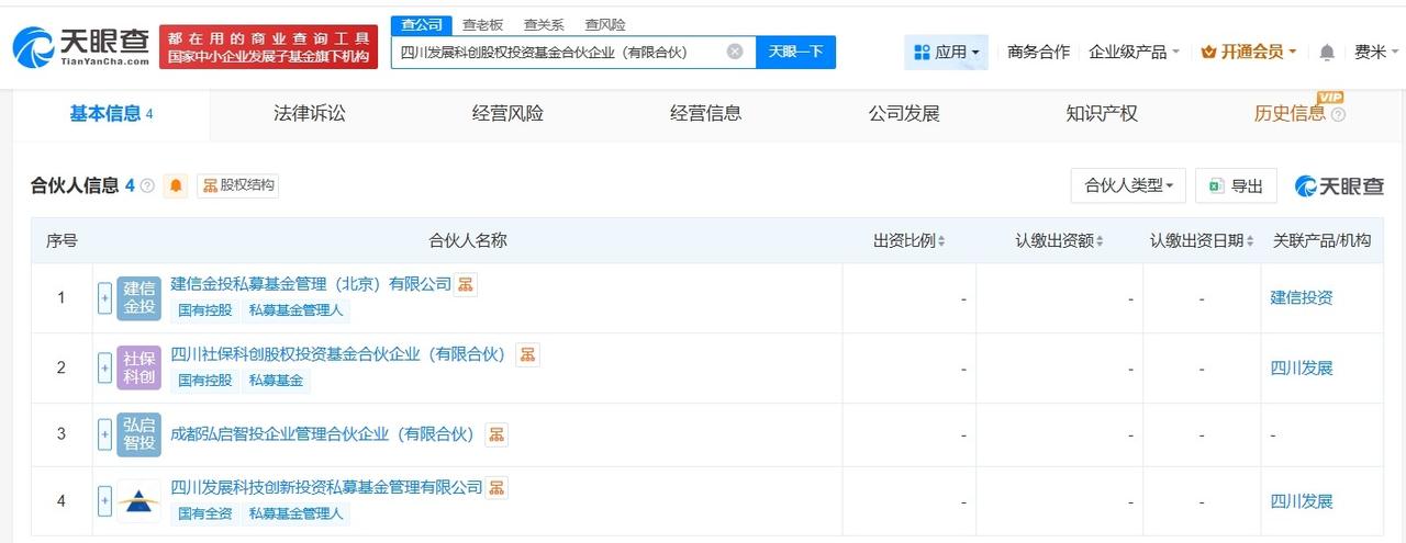 天眼查App显示,近日,四川发展科创股权投资基金合伙企业(有限合伙)成立,执行事务合伙人为四川发展科技创新投资私募基金管理有限公司、建信金投私募基金管理(北京)有限公司,出资额约101.2亿人民币,经营范围为以私募基金从事股权投资、投资管理、资产管理等活动。合伙人信息显示,该基金由建信金投私募基金管理(北京)有限公司、四川社保科创股权投资基金合伙企业(有限合伙)、成都弘启智投企业管理合伙企业(有限合伙)等共同出资。