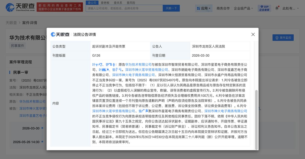 公告显示,原告华为技术有限公司请求判令被告立即停止不正当竞争行为、删除所有侵权产品的销售链接、各被告连带赔偿原告经济损失及合理维权费用共100万元并在涉案店铺首页置顶位置连续一个月刊登向原告道歉的声明等。自公告发出之日起,经过三十日即视为送达,并定于5月26日公开开庭审理。
