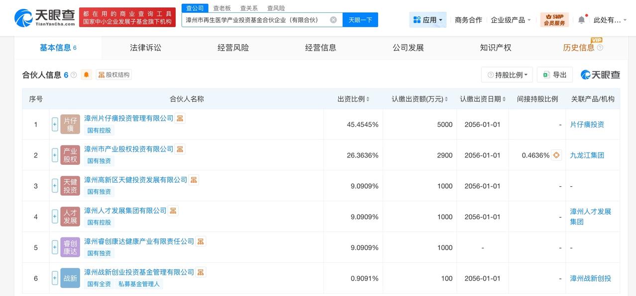 天眼查工商信息显示,近日,漳州市再生医学产业投资基金合伙企业(有限合伙)成立,执行事务合伙人为漳州战新创业投资基金管理有限公司,出资额1.1亿人民币,经营范围为以私募基金从事股权投资、投资管理、资产管理等活动。合伙人信息显示,该基金由漳州片仔癀投资管理有限公司、漳州市产业股权投资有限公司、漳州高新区天健投资发展有限公司等共同出资。