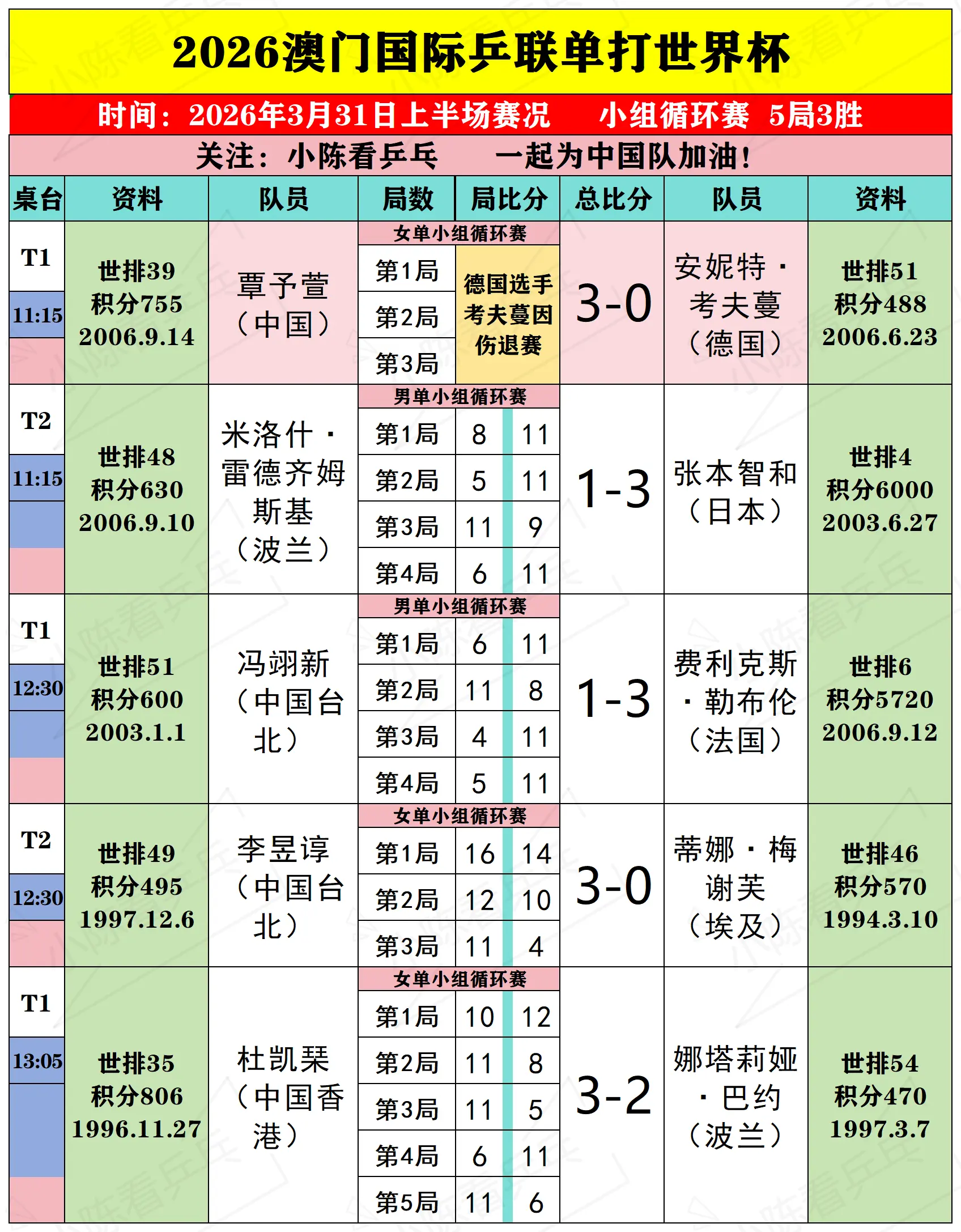 2026澳门单打世界杯3月31上半场赛况。2026澳门单打世界杯3月31日上半场比赛结果,男女单打小组循环赛,中国队女单覃予萱对手因伤退赛,覃予萱自动获得胜利,下一轮对阵早田希娜决赛谁能晋级,男单梁靖崑2-3不敌阿根廷选手西福恩特斯无缘首胜,下一轮对阵奥恰洛夫需要3-0或3-1方可晋级淘汰赛,中国队继续加油。