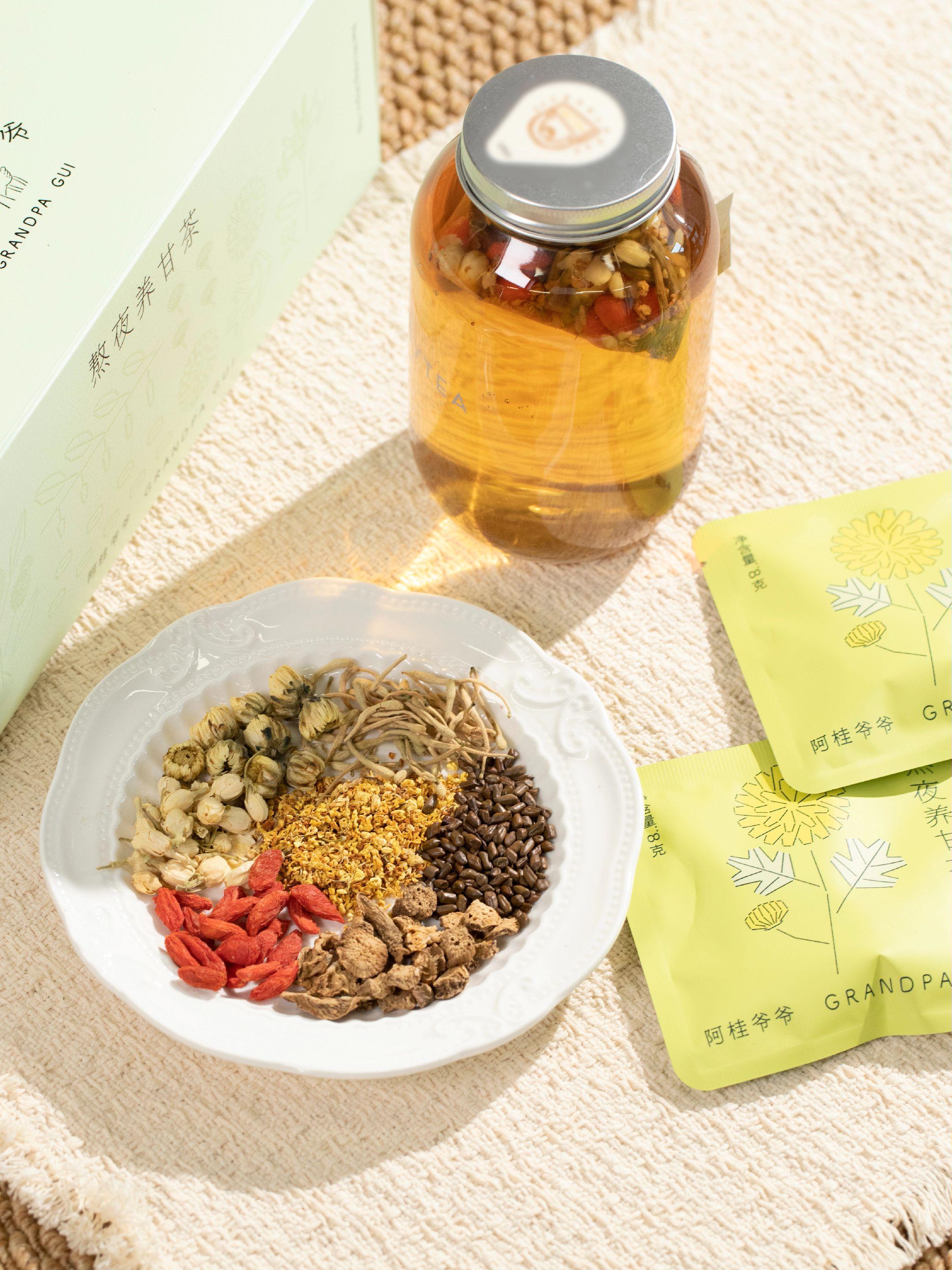 选用了菊花、枸杞、金银花、牛蒡根、决明子、茉莉花和桂花等食材。