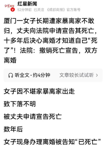 福建厦门,女子常年被丈夫家暴,被打的受不了就离家出走了,多年一直在外地漂泊流浪。5年后,她拿着身份证,回当地办理离婚手续, 却得知一个让她脊背发凉的消息:系统里,她早在几年前就被宣告死亡了,根本办不了离婚。而这一切,都拜她的丈夫所赐! 2012 年 11 月,厦门女子小翠在又一次遭受丈夫大军的严重殴打后,彻底失去了对婚姻的希望。她不敢再留在那个充满暴力的家,连夜收拾简单行李,悄无声息地离开了厦门,从此与家人彻底断绝联系,开始了在外漂泊的生活。 她不敢联系任何人,生怕被丈夫找到,只能隐姓埋名,在不同城市辗转,靠打零工勉强维持生计。 这一走,就是整整十三年。2025 年 7 月,小翠终于鼓起勇气,决定回到厦门,用法律手段结束这段早已名存实亡的婚姻。她以为只要拿着身份证,就能顺利办理离婚,彻底摆脱过去的噩梦。可当她走进婚姻登记处,将身份证递到工作人员面前时,得到的答复却让她如坠冰窟。 工作人员反复核对系统信息后,明确告知她,系统显示她已于 2020 年 7 月被法院宣告死亡,一个已经 “死亡” 的人,是无法办理离婚手续的。这个消息像一道惊雷,劈在小翠头上,她怎么也想不通,自己明明好好活着,怎么就成了法律意义上的 “死人”微博。 她立刻意识到,这一切的始作俑者,只能是她的丈夫大军。 原来,在小翠离家出走半年后的 2013 年 5 月,大军就向当地派出所报案,称妻子走失,多方寻找无果。此后的几年里,他从未真正寻找过小翠,却在 2019 年 6 月,以小翠下落不明满四年为由,向厦门市翔安区人民法院申请宣告小翠死亡微博。 法院受理此案后,按照法定程序进行了严格核查。大军提交了亲属证言、社区证明、报警回执等材料,这些材料从表面上看,足以证明小翠已下落不明满四年,且经多方寻找仍无音讯。在穷尽所有法定流程后,法院于 2020 年 7 月依法作出判决,宣告小翠死亡。 而这一切,远在外地的小翠毫不知情,她依旧在为生存奔波,从未想过自己的身份已被法律 “抹去”。 得知真相后,小翠没有被击垮,她立即向翔安区人民法院递交申请,请求撤销对她的死亡宣告。她向法官详细陈述了自己因不堪家暴而离家出走的全部经过,并提供了多年来在外地的居住证明、工作记录、身份凭证等完整证据,证明自己一直活着,从未失踪。 法院依法传唤大军到庭核实情况。面对小翠提交的铁证,大军无法否认,只能承认双方多年无联系,小翠确已重新出现的事实。 承办法官严谨审查全部材料后,认定小翠重新出现的事实清晰,其申请完全符合《中华人民共和国民法典》第五十条的规定,当即作出新判决,撤销了 2020 年宣告小翠死亡的原判决中华人民共和国最高人民法院公报。 身份恢复后,小翠立即提起离婚诉讼,要求彻底解除这段长达三十年的婚姻关系。此时的大军,面对早已破碎的婚姻和无法挽回的局面,也同意离婚。 在法官的主持下,双方最终达成调解协议:自愿离婚,婚姻存续期间各自名下的财产、债权归各自所有,债务由各自负担。这场持续了五年的 “被死亡” 闹剧,终于画上了句号。 类似的案例并非个例。此前,多地也曾发生过因配偶长期失联,被利害关系人申请宣告死亡的情况。比如,有男子外出打工失联多年,被家人宣告死亡,多年后返乡才发现自己 “被死亡”. 也有女子因家庭矛盾离家,被丈夫宣告死亡后,再婚生子,最终引发复杂的法律纠纷。这些案例都反映出,宣告死亡制度在保护利害关系人权益的同时,也可能因信息不对称,给当事人带来意想不到的伤害。 小翠的经历,是家暴受害者遭遇的又一重困境。她先是遭受身体与精神的双重折磨,被迫逃离家园,后又被丈夫利用法律手段 “抹去” 存在,连离婚的基本权利都被剥夺。这不仅是个人的悲剧,也折射出家暴受害者在维权过程中可能面临的多重障碍。 值得庆幸的是,法律最终为小翠主持了公道。撤销死亡宣告的判决,不仅恢复了她的合法身份,更让她有机会彻底摆脱那段痛苦的婚姻。这也提醒我们,法律是公平正义的底线,但在具体实践中,更需要对弱势群体多一份保护,对恶意利用法律的行为多一份约束。 一个好好活着的人,却被最亲近的人宣告 “死亡”,这不仅是对个人权利的践踏,更是对法律尊严的挑战。 家暴本就不该存在,而利用法律手段报复、伤害家暴受害者的行为,更应受到谴责。我们在为小翠重获自由感到欣慰的同时,也不禁要问:还有多少家暴受害者,在逃离深渊后,仍面临着不为人知的困境? 面对此类恶意利用法律的行为,我们又该如何更好地保护受害者的合法权益?
