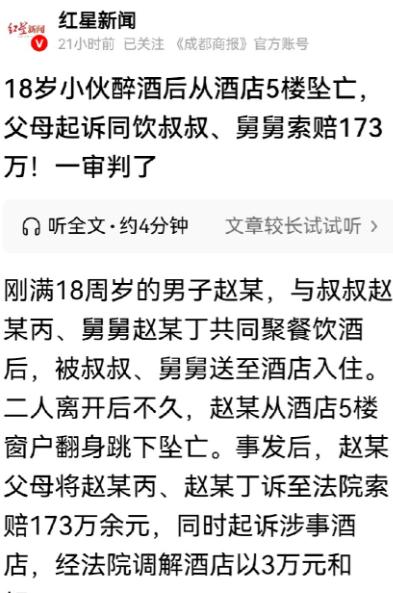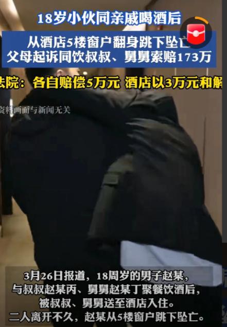 意外还是发生了!广东深圳,18岁的小伙,和自己的叔叔、舅舅一块喝酒,两位长辈看到他有点醉了,就直接给他开了一个房间,把他送到了酒店睡觉醒酒。不料,两人离开后,小伙开门出来,在走廊里敲其他客人房门,后来,竟在酒店5楼的窗户跳下坠亡。小伙父母痛不欲生,怨恨两位长辈没有照顾儿子,将两人告上法庭,要求赔偿各项损失173万元,法院这样判。 2024 年 8 月 23 日晚,赵某与叔叔赵某丙、舅舅赵某丁在餐馆聚餐。三人推杯换盏,赵某喝下大半瓶白酒,很快出现明显醉态。 两位长辈见状,没有联系他的父母,也没有送医醒酒,而是就近开了一间酒店房间,将他搀扶进去后便自行离开。他们以为,给醉酒的晚辈找个地方睡觉,就是尽到了照顾的义务。 他们低估了酒精对一个刚成年年轻人的控制力。凌晨 0 时 49 分,两位长辈离开酒店。仅仅一个小时后,监控显示,赵某走出房间,在走廊里神志不清地敲击其他客人房门,随后走向 5 楼走廊尽头的窗户,翻身跳下。 当酒店工作人员发现时,一切都已来不及。一个年轻的生命,就这样在无人看护的深夜,永远定格在了 18 岁。 噩耗传来,赵某的父母陷入巨大的悲痛。他们无法接受,自己的儿子是在两位至亲的照顾下出事的。在他们看来,正是叔叔和舅舅的疏忽,才导致了悲剧的发生。他们一纸诉状,将赵某丙、赵某丁以及涉事酒店一并告上法庭,索赔各项损失共计 173 万元。 法庭上,双方展开激烈争辩。赵某父母认为,两位长辈作为共同饮酒者和亲属,在明知赵某深度醉酒、行为失控的情况下,仅仅将其送至酒店便离开,完全未尽到监护和照顾义务,对儿子的死亡负有不可推卸的主要责任。 而两位长辈则觉得委屈,他们辩称,自己已经出于好心安排了住宿,离开时赵某看似安静,无法预料后续会发生如此极端的行为。 法院审理后,调取了酒店监控和公安机关的询问笔录。证据清晰显示,赵某入住时满身酒气,入住后不久便在走廊出现异常行为,足以证明其处于危险的失控状态。根据《民法典》相关规定,共同饮酒人之间负有合理的安全注意义务,尤其是长辈对晚辈,这种义务更重。 法院最终认定,赵某丙、赵某丁在赵某醉酒后,未采取联系家属、安排专人陪护或持续监护等有效措施,未尽到应尽的注意义务,存在明显过错,应当承担相应的民事赔偿责任。 同时,赵某作为完全民事行为能力人,对自己的饮酒行为和后果有认知能力,其自主翻越窗户的行为是导致死亡的直接原因,应承担主要责任。 据此,法院作出判决:赵某丙、赵某丁各自赔偿赵某父母 5 万元;涉事酒店则通过调解,赔偿 3 万元。173 万的巨额索赔,最终仅换来 13 万的赔偿。这个结果,既没有满足原告方的期待,也让两位长辈背上了沉重的经济和心理负担。 类似的悲剧并非个例。此前,多地法院都审理过共同饮酒后意外身亡的案件。有男子被朋友送至小区门口后独自回家,最终坠楼身亡,共饮者被判担责;也有年轻人醉酒后在酒吧楼梯摔倒身亡,酒吧因未尽安全保障义务被判赔偿。 这些案件的判决逻辑高度一致:共饮者的注意义务,不会因为 “送了一程” 就自动终止。 这些案例都在传递一个明确的信号:酒局不是免责牌。当你与他人共饮,尤其是对方已显醉态时,你的责任才刚刚开始。简单的 “送走” 不等于 “安全”,更不等于 “尽责”。法律所要求的,是一个完整的、闭环的安全保障,直到醉酒者脱离危险。 回到这起深圳的悲剧,10 万元的赔偿,对于失去独子的父母而言,不过是杯水车薪。对于两位长辈而言,这不仅是金钱的损失,更是一辈子无法释怀的愧疚和亲情裂痕。一条年轻生命的逝去,三个家庭的破碎,根源就在于那一句 “以为没事” 的侥幸。 酒桌之上,推杯换盏是情分;酒局之后,安全护送是本分。我们总以为意外离自己很远,总以为 “喝一点没关系”,总以为 “睡一觉就好”。但无数血淋淋的教训告诉我们,在酒精面前,任何侥幸都可能酿成大祸。 这起案件的判决,不是为了惩罚谁,而是为了警醒所有人。它用最沉重的方式告诉我们:成年人的世界,没有那么多 “下次注意”。每一次举杯,都意味着一份责任的开始。 当你身边有人喝醉,请务必多一份耐心,多一份担当,直到确保他绝对安全。因为你永远不知道,你的一次疏忽,会付出怎样惨痛的代价。 生命只有一次,无法重来。在人情与法律之间,在情谊与责任之间,我们该如何选择?这起发生在深圳的悲剧,值得每一个人深思。