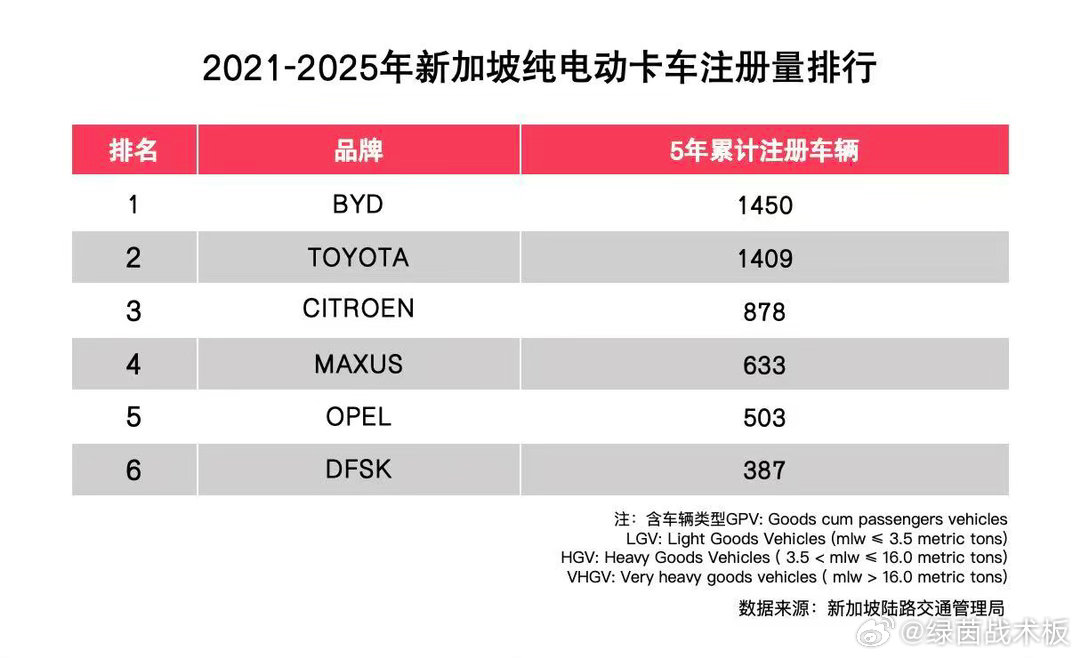 在电动卡车领域,比亚迪于2020年进入新加坡,开始向当地正式交付环卫车T9,成为当地第一家销售电动卡车的公司。2021年-2025年,比亚迪纯电卡车在新加坡五年累计注册量达1450台,排行第一。