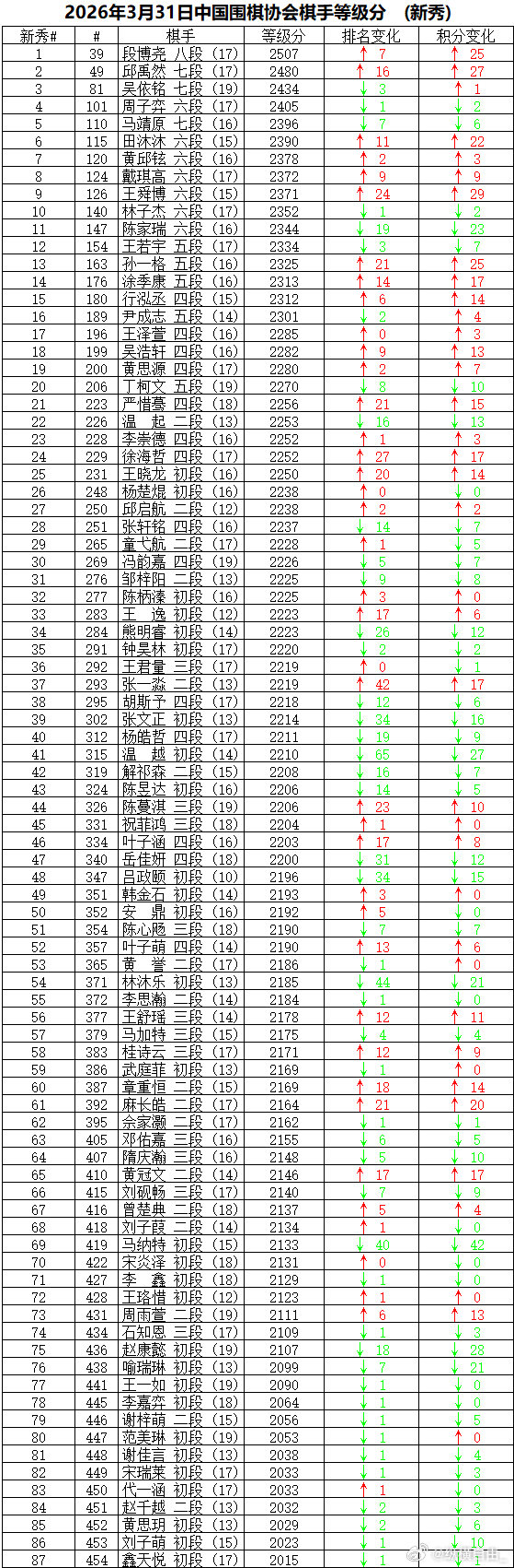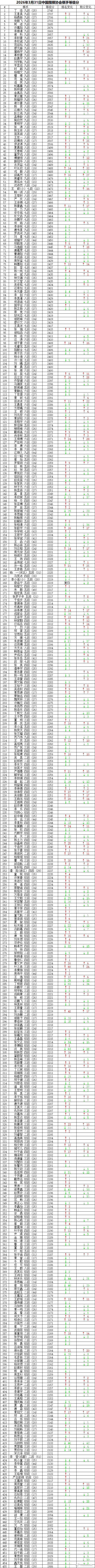 中国围棋职业棋手等级分 2026年3月,等级分对局689局,娄洛宁复归,等级分活跃棋手455人。本月排名前十的棋手变化不大,王星昊勇夺棋王争霸赛冠军,李轩豪首夺西南王,两人积分分别增加4分和21分,各自上升两位,排在第二和第九。叶长欣在倡棋杯和烂柯杯青少年赛中取得11胜2负,积分增加32分,是本月积分增加最多的棋手,上升14位,排在第47。王舜博取得10胜4负,积分增加29分,仅次于叶长欣,上升24位,排在第126。叶之泉在烂柯杯青少年赛中取得6胜3负,积分增加24分,排名上升60位,是本月排名上升最多的棋手,排在第280;张一淼本月5胜4负,增加17分,上升42位,上升幅度仅次于叶之泉,排在第293。107位女子棋手保持在等级分活跃榜,前五位排名没有变化,女子顶尖棋手的排名可能要等到五月份女子围甲开赛,才能有显著的改变。新秀榜拥有87名棋手,刚在烂柯杯青少年赛第一站夺冠的段博尧领衔新秀榜,积分增加25分,上升7位,排第39,挤进前40名。邱禹然排在第二,增加27分,上升16位,排在第49,也进入等级分前五十。吴依铭最后一年领衔新秀女子榜,在全部新秀中排在第三。10后棋手中代表,马靖原、田沐沐、黄邱铉都距离等级分前百咫尺之遥。(注:本表仅供参考,具体以围棋协会颁布为准)