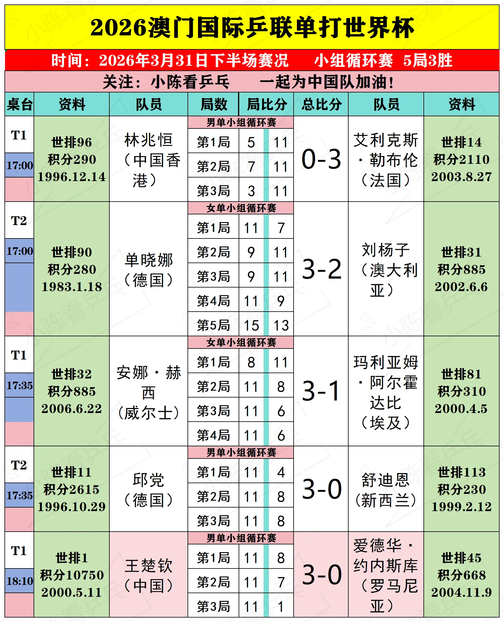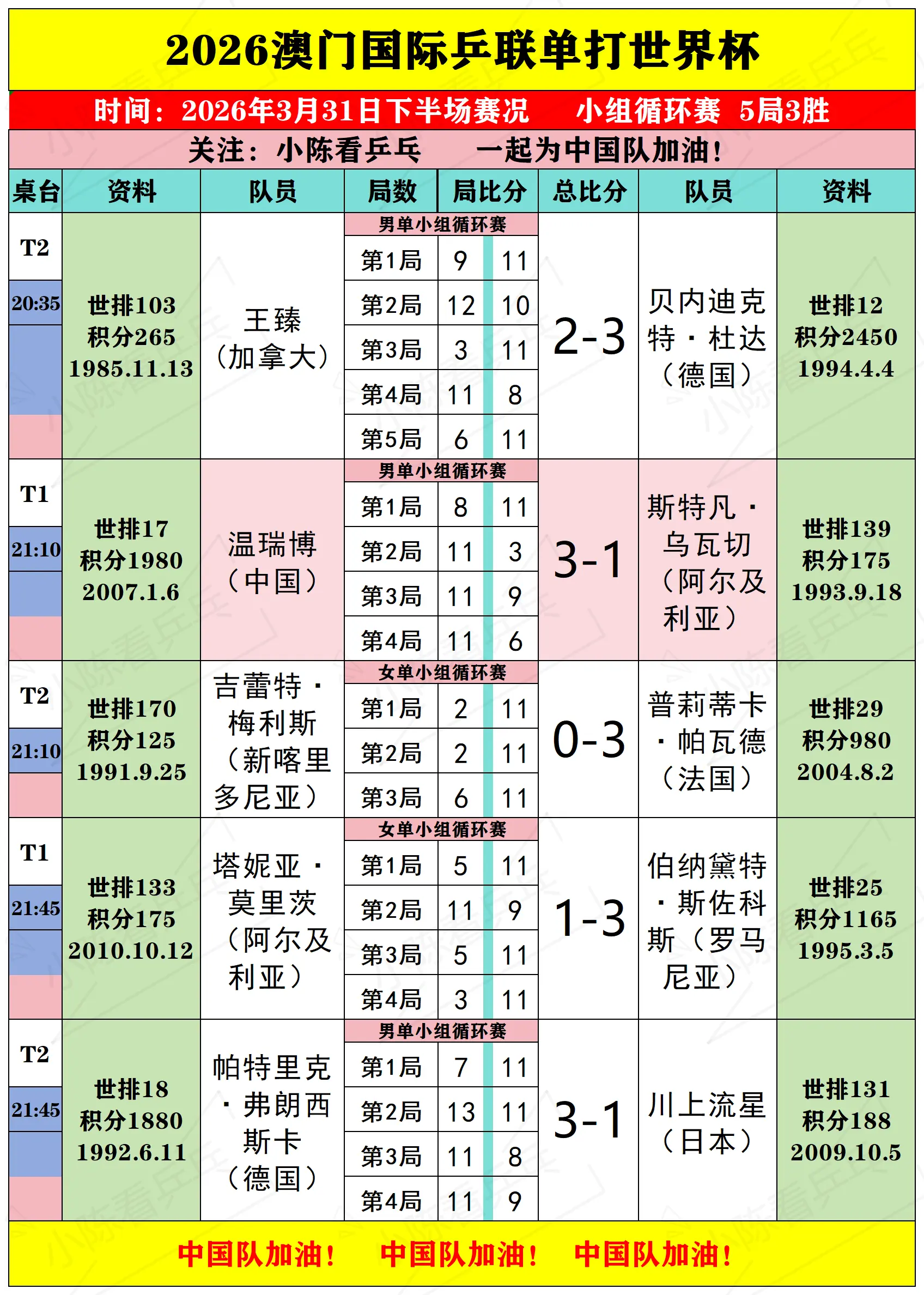 2026澳门单打世界杯3月31下半场赛况。2026澳门单打世界杯3月31日下半场比赛结果,男女单打小组循环赛,中国队男单王楚钦3-0战胜罗马尼亚选手爱德华·约内斯库迎小组首胜,温瑞博3-1战胜阿尔及利亚选手斯特凡·乌瓦切迎小组首胜,中国队继续加油。