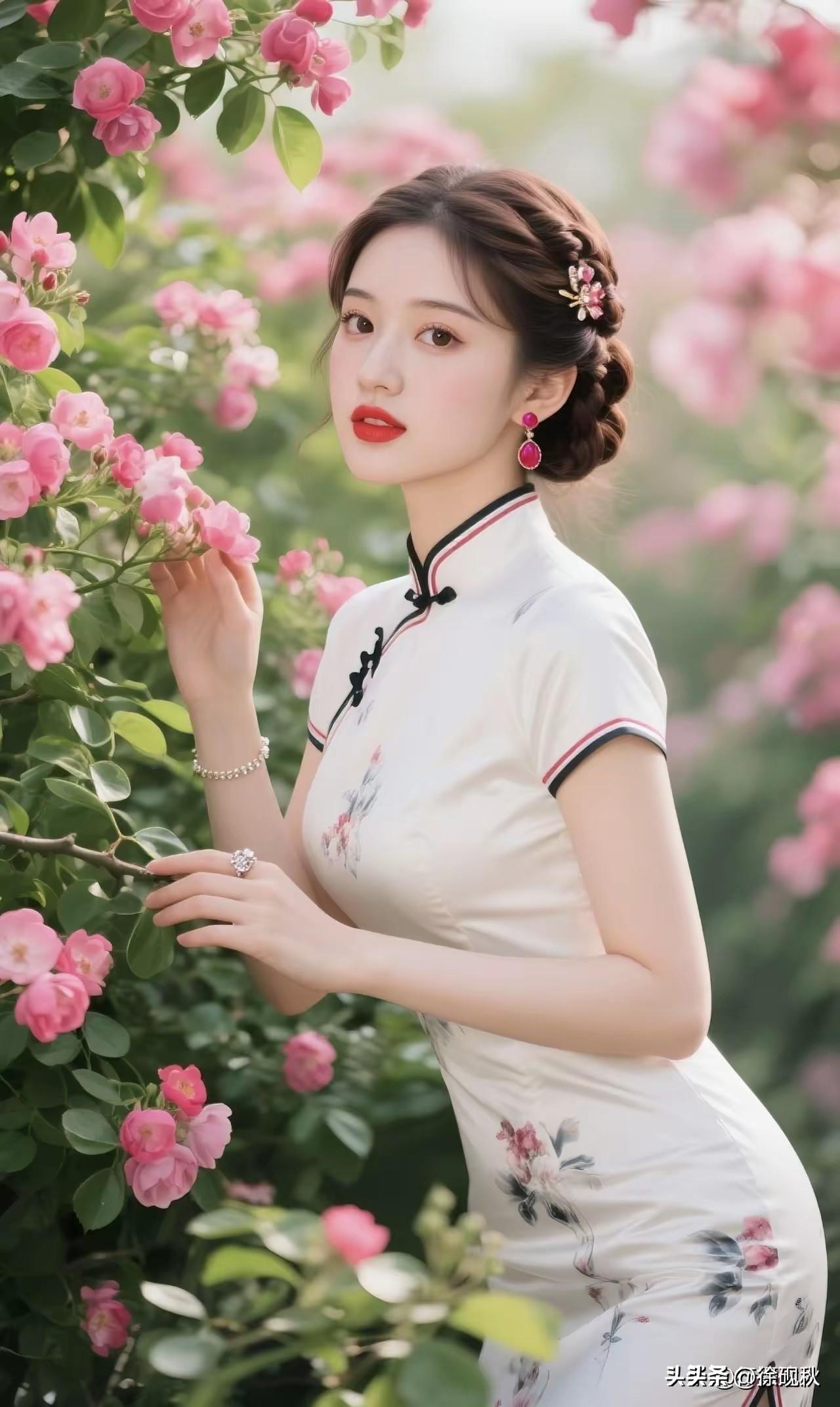 粉云堆雪绕芳丛, 玉立佳人浅笑中。 最是江南春好处, 旗袍雅致倾人城。