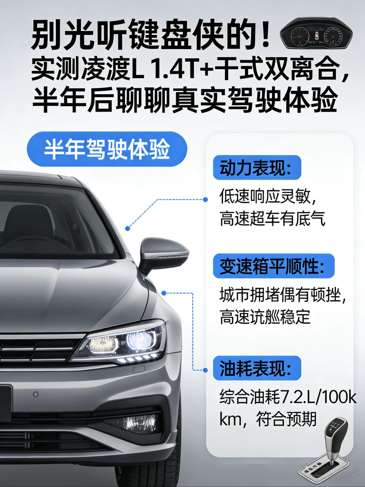 开了半年凌渡L,聊聊这台“大众轿跑”的真实驾驶体验 兄弟们,今儿不聊参数,不报配置表,就唠唠我开了小半年的这台凌渡。我买的是2025款280TSI酷辣版,1.4T那个版本,当时落地谈下来15.8万左右。 当初买它,身边说什么的都有:“落地十五六万买个大众,还是个特供车,图啥?”、“这无框车门帅是帅,以后不隔音不渗水?”、“1.4T 150匹?动力够用吗?” 今天,咱就从我个人感受最深的这个“驾驶体验”维度,好好掰扯掰扯。注意,是纯主观体验,不是产品说明书。 一、它开起来真的不像“传统大众” 我以前也开过老款的帕萨特、速腾,那种感觉很“德系”,底盘稳,但转向手感偏沉,开着是踏实,但少了点乐趣。 凌渡一上手,第一感觉是“轻”。 方向盘轻,油门初段也轻,在城市里跟车、掉头,特别轻松,完全没有开大车的压力。这点对我媳妇这种“停车恐惧症”患者特别友好。但你别以为“轻”就是飘,上了高架或者快速路,速度起来之后,方向盘会变沉一些,给你足够的安定感。 这种标定,我觉得大众是琢磨了国内用户心理的,先让你好上手,不劝退,再给你点高级感。 有朋友跟我说,这不就是“电子味”重了吗?但说实话,日常通勤谁天天要那种沉重的机械感?开着不累比什么都强。 二、聊聊这个争议最大的1.4T+干式双离合 网上“键盘侠”一听到干式双离合,那跟见了鬼似的。我买车前也犯嘀咕。 但实际用下来,我必须说,大众这套东西,匹配得是真娴熟。 在市区里,2、3档来回切换,绝大多数时候你感觉不到顿挫,升档积极,动力衔接很顺。除非你特别龟速地、含着刹车跟车,偶尔能感觉到一点点轻微的拉扯感,但完全在可接受范围内,比我开过某些国产双离合和CVT在低速时的表现还要好。 动力嘛,中段加速(40-80km/h)是它的甜点区,超车很有信心,推背感谈不上多猛,但够用。上了120km/h再想急加速,就得耐心等它降档了,毕竟基础排量在这,后劲确实一般。 所以,如果你不是天天想着崩零百、跑山,这套动力总成应对90%的日常场景,是合格且高效的。 三、底盘,是给我“高级感”的主要来源 凌渡L的底盘调校,我觉得是在运动和舒适之间找了个很聪明的平衡点。 过一些小坑洼和减速带,“砰、砰”两下,声音很干脆,车身没有多余的晃动,你能感觉到悬挂是有韧劲的,不是傻软。 但当你以较快速度过弯,或者紧急变线时,侧向支撑又很到位,能给你很强的信心。 这种底盘质感,是很多同价位日系车给不了的。它们可能更软,但像坐船;也比一些过分追求运动、硬得颠屁股的车更适合家用。 它让你觉得,这车是有“沟通感”的,你在驾驶,而不是仅仅在操作一个交通工具。 四、驾驶中的槽点,不藏着掖着 无框车门,帅是真帅。但风噪,确实比有框车门大一点。 尤其上了高速,主要来自A柱和后视镜那块,能接受,但你要有心理准备,它不是图书馆。时速过了100,风声就开始明显了,开音乐能盖住,但如果你对静谧性要求特别高,建议试驾时专门跑一段高速听听。 还有个车友群经常吐槽的,倒车雷达太灵敏了。 离老远就开始滴滴滴,搞得人紧张兮兮的。不过我倒觉得,总比不响强吧?习惯了也就那样。 五、那到底冤不冤? 回到开头的问题,花这个价钱买凌渡,驾驶体验到底值不值? 对我而言,不冤。 它满足了我对一台日常代步车的核心需求: · 转向轻快,城里开不累 · 动力平顺,双离合不顿挫 · 底盘有韧性,过弯有信心 · 偶尔想踩一脚,中段超车也能跟上 它确实不是性能猛兽,零百加速8秒多,比不过那些电车;底盘质感也比不上更高级别的B级车。但在这个价位,它提供了一种非常“均衡”且带有“精致运动感”的驾驶体验。 那什么人适合?什么人劝退? 如果你追求极致的加速、极致的静谧性,或者就想买个纯家用代步工具,那它可能不是你的菜。 但如果你是个对驾驶质感有要求,又不想车子过于平庸无聊的普通年轻家庭用户,那凌渡L的驾驶体验,真的值得你去4S店好好开两圈,自己感受一下。 别光听别人说,车是自己开的,鞋子合不合脚,只有脚知道。 我这半年,开着它,大部分时间是愉悦的。每次过个弯、超个车,底盘给的回馈和方向盘的响应,都让人觉得这车是跟你沟通的,不是冷冰冰的交通工具。 这就够了。【来自懂车帝车友圈】