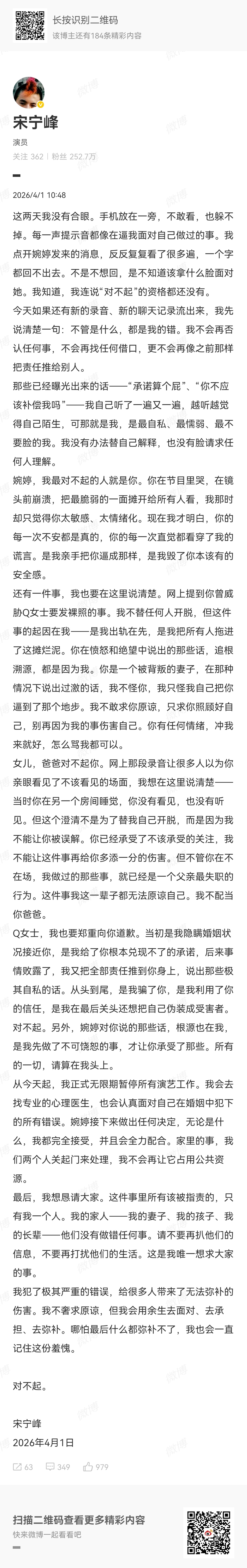 宋宁峰将暂停所有演艺工作宋宁峰发文承认了自己出轨Q女士,也承认了张婉婷确实拿裸照