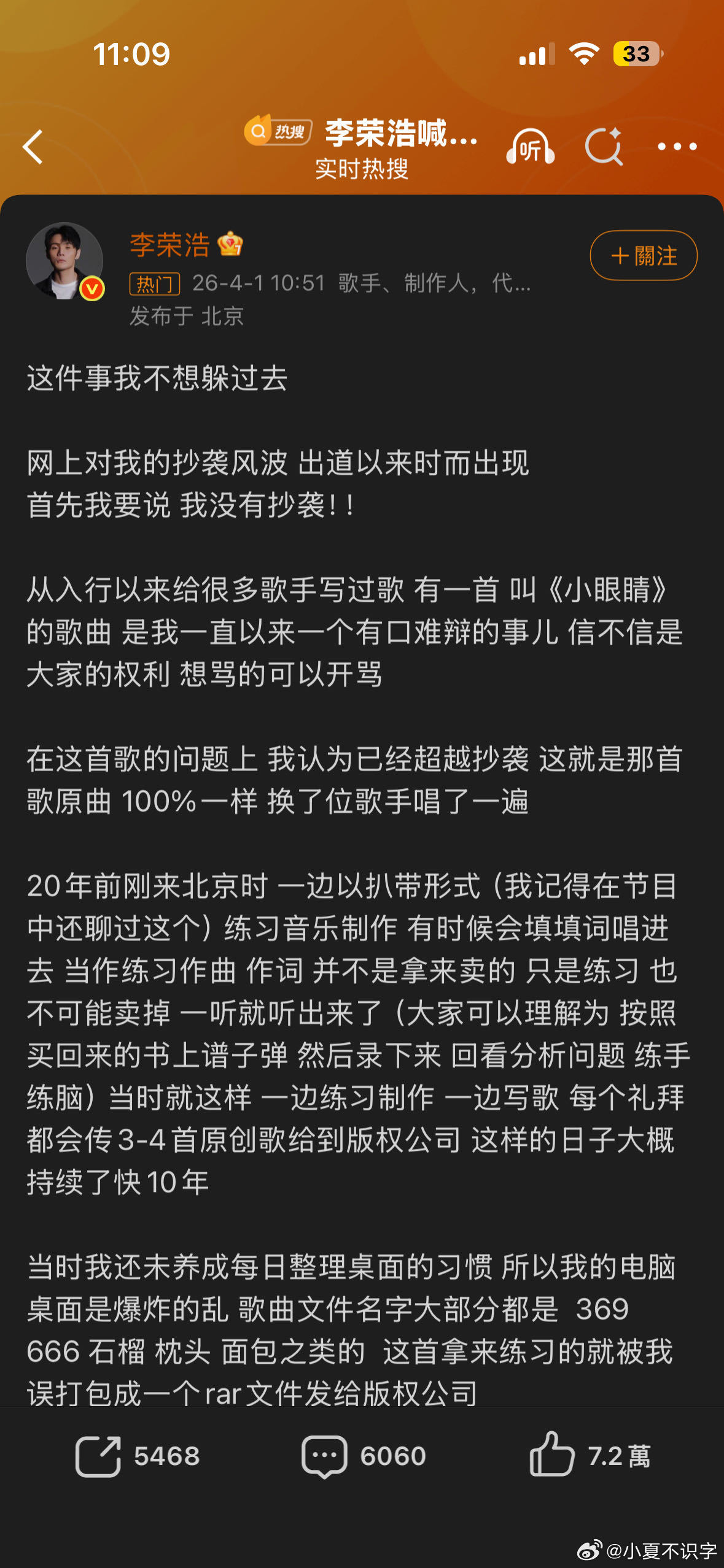 李荣浩 哪个250会抄得一模一样 支持正常维权,也反对无底线造谣,这种一眼假的节奏真的没必要跟着起哄,相信公道自在人心
