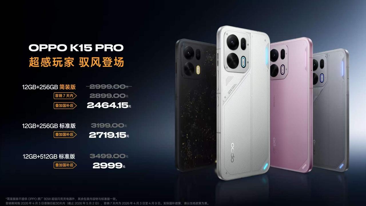 2026年4月1日OPPO K15系列发布会如期举行,周掌柜小编在线全程观看。OPPO这次不走影像路线,直接在中端机里搞起了“主动风冷+超大电池+双旗舰芯片”的组合拳,K15 Pro系列目标很明确:让你玩游戏爽、续航顶、用着不慌。发布会有K15 Pro 和 K15 Pro+ 两个版本亮相,全系标配LPDDR5X+UFS4.0,12GB起步。小编通过几个方面来梳理发布会看点: 屏幕素质方面:全系1.5K OLED直屏,全程DC调光,游戏场景下触控采样率至高800Hz,Pro+版本触控响应更快。 散热值得点赞👍:全系内置新一代疾风散热引擎,主动风扇+低阻风道+疏密错位散热鳍片+VC均热板。风扇转速没给具体数值,但官方说50%转速下噪音低至19dB,堪比静音室。风扇通过5年运行寿命测试,支持IP69满级防尘防水(比IP69K还高一级)。 关于影像:后置5000万像素OIS主摄+800万超广角,前置1600万像素,够用不堆料。 设计和防护:金属中框+晶盾玻璃,背面有岚影呼吸灯,支持游戏/音乐/来电联动。配色有赛博光翼、光尘粉、起源灰三款,Pro版还有个专属“金色传说”,配原厂锻造碳后盖,每台纹理都不一样。另外支持DIY磁吸镜头盖,可以自己换Deco甚至打印专属配件。 续航方面: K15 Pro:7500mAh + 80W闪充 Pro+:8000mAh + 100W闪充 全系首发自研冰川电池聚能芯片,20%低电量时还能满血流畅运行。支持旁路供电(边充边玩不伤电池)、反向充电,出门不用带充电宝。 日常使用:流畅耐造,跨生态友好。天玑芯片+潮汐引擎能效不错,刷短视频、导航多任务都不烫。金属中框+晶盾玻璃抗摔耐磨,IP69防水户外用着安心。系统是ColorOS 16,跟苹果生态无缝互联:iPhone来电能在OPPO上提醒、Apple Watch信息同步、AirPods原生连接、苹果备忘录一键迁移——双持党狂喜。 小编认为打游戏,散热静音两不误,中端机里少见。主动散热系统让整机散热效率大幅提升,配合潮汐引擎调校,高负载游戏稳帧不降频。Pro+多了物理肩键和超感触控芯片,玩射击游戏开镜开枪顺手不少,还能开光追。风扇噪音控制得不错,录音、直播时还有降噪算法,不用担心风扇声收进去。 总的来说,本系列属于中端机塞进主动风扇+大VC,散热稳帧绝对有一手。大电池+快充,续航直接拉满,双旗舰芯片方案。Pro+还带肩键和光追,性价比能打。 IP69防水+金属中框+呼吸灯+DIY镜头盖,质感、防护、可玩性都越级,ColorOS 16和苹果生态打通,跨平台用着顺。尤其游戏重度用户:直接冲K15 Pro+,光追、肩键、165Hz、8000mAh全拉满。日常+偶尔玩游戏:K15 Pro性价比更高,7500mAh够用一整天,小直屏手感也舒服。 当然,小编特殊提醒消费者,OPPO K15系列拍照就是够用水平,没长焦,摄影发烧友绕道。风扇虽安静但极静环境下能感知到,机身因大电池+散热系统稍厚重,喜欢轻薄的要掂量下。 价格方面(国补后) K15 Pro:2464.15元~2999元之间。 K15 Pro+:2634.15元~ 3499元之间。 小编觉得OPPO K15系列机就是给学生党、手游玩家、续航焦虑党、户外党准备的,不卷影像,把散热、续航、性能、防护做到同价位天花板。 一句话:OPPO K15 Pro系列不做“全能水桶”,但在游戏、续航、散热、防护这几个硬需求上,确实卷到了中端机的天花板。目标用户清晰,产品力扎实,还整了DIY镜头盖这种好玩的东西,属于买回去不会后悔的“实用派+个性派”选手。欢迎大家使用后给小编留言。