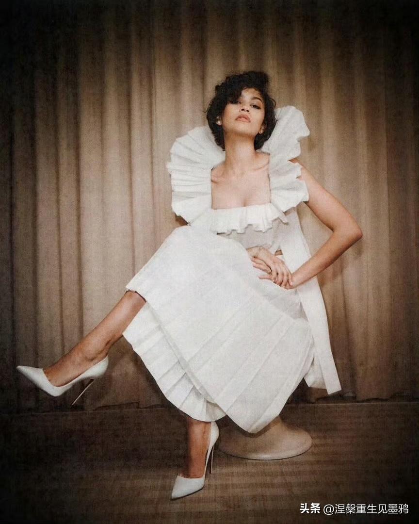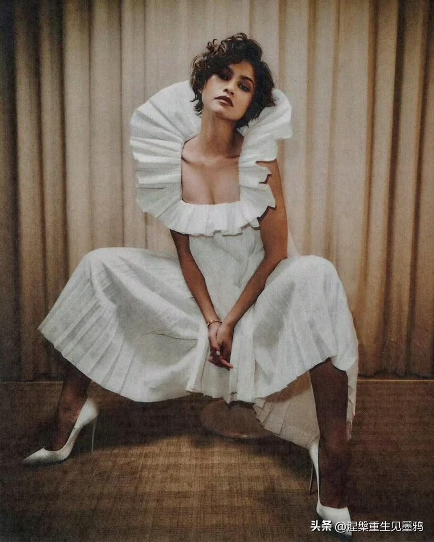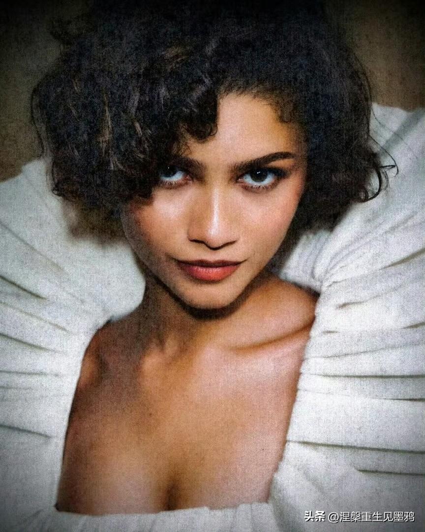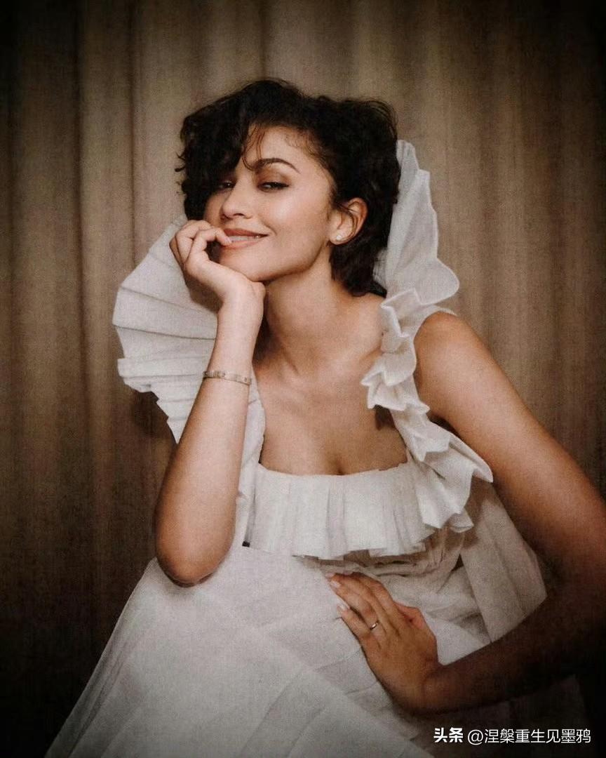 赞达亚x《爱情抓马》宣传照,柔光衬着短卷发的柔和弧度,米白褶皱礼裙衬出赞达亚舒展