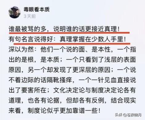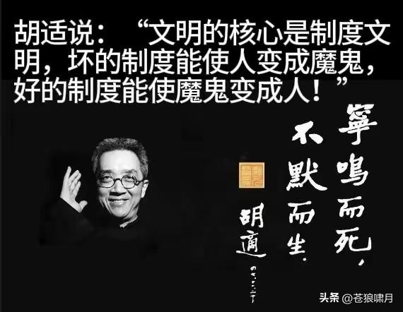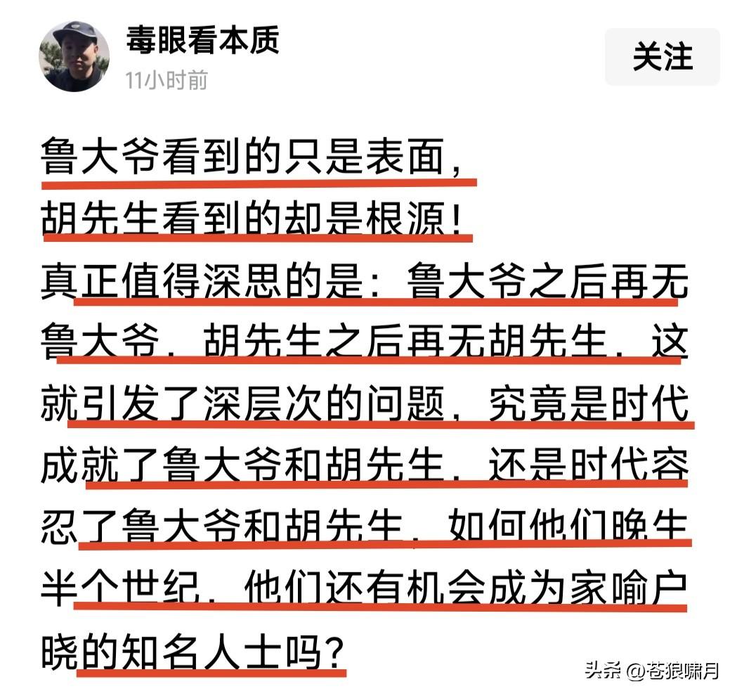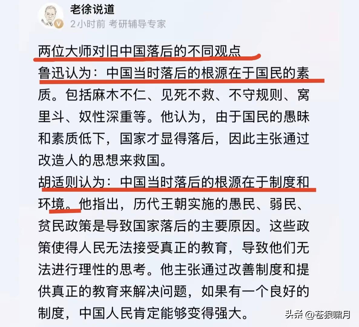 鲁迅与胡适两位大师,谁更加伟大?请看老徐与“毒眼”,是怎么说的? 老徐说:两人对旧中国落后原因剖析,观点不同各有侧重。鲁迅认为是国民素质不高造成;胡适认为是制度落后环境守旧导致。两种观点都有道理。 毒眼说:鲁大爷看到的是表面,胡先生看到的是根源。谁被骂最多,谁说的话就更接近真理。因为真理掌握在少数人手里,探求真理要付出代价的! 本人觉得老徐与毒眼,说的都对,区别在于站位不同。一个立足文化内涵,一个站在社会高度,但殊途同归。 苍狼觉得鲁迅与胡适同样伟大!因他们指出当时中国落后的原因:国民素质不高与制度落后,是相辅相成关系。 没有好的制度,国家当然不能进步!但若国民素质不提高,再好的制度也落实不了。因此建设好的社会制度,与提高国民素质同等重要,缺一不可啊! 我们正在建设文明社会,就是为解决以上两大问题做的努力!社会主义核心价值观,提出“制度建设”与“国民素质提升”两大目标,坚定践行未来可期! …………