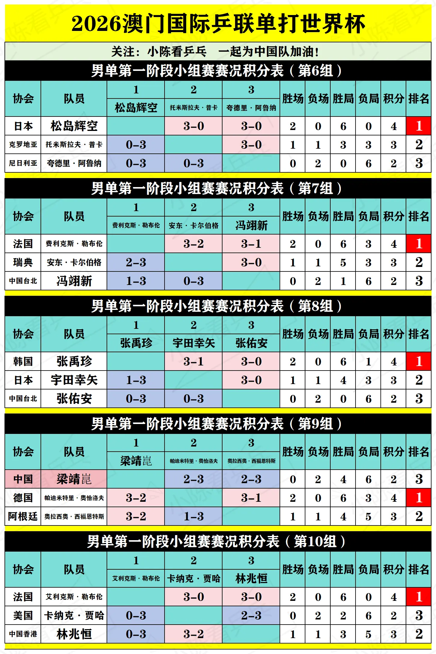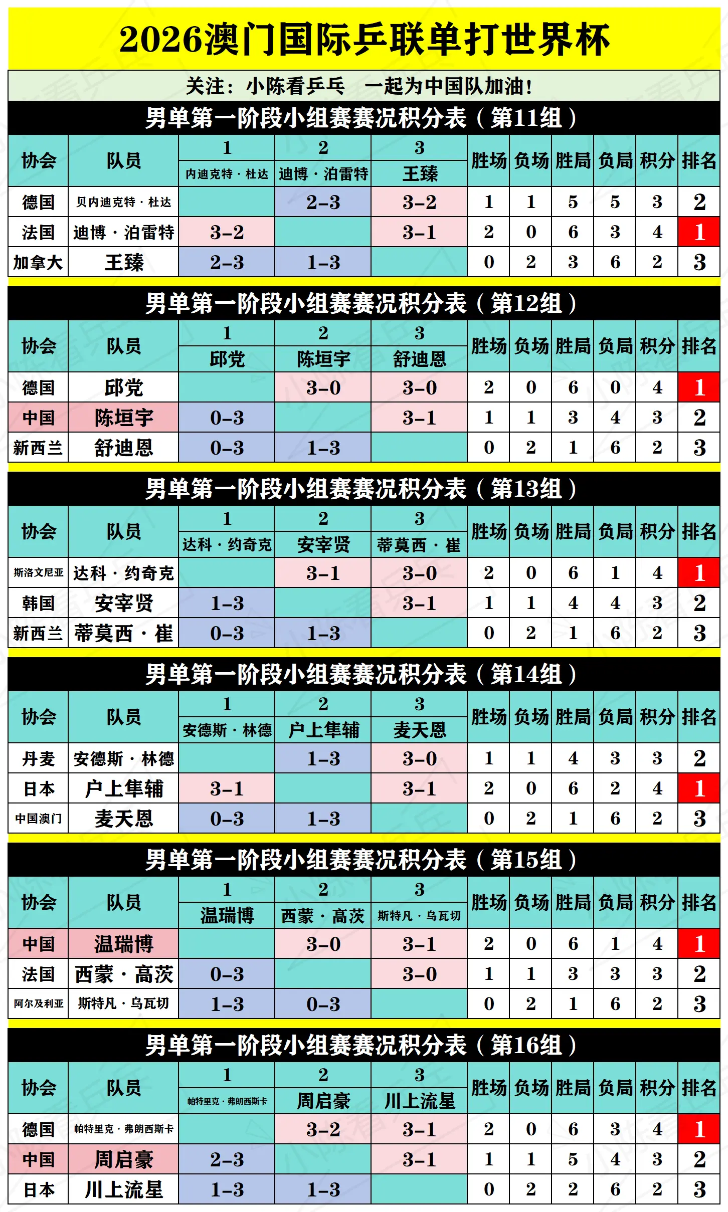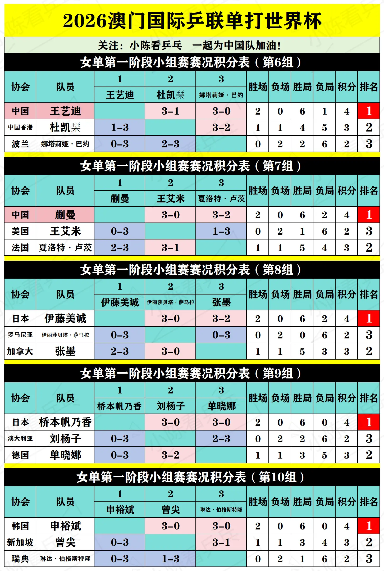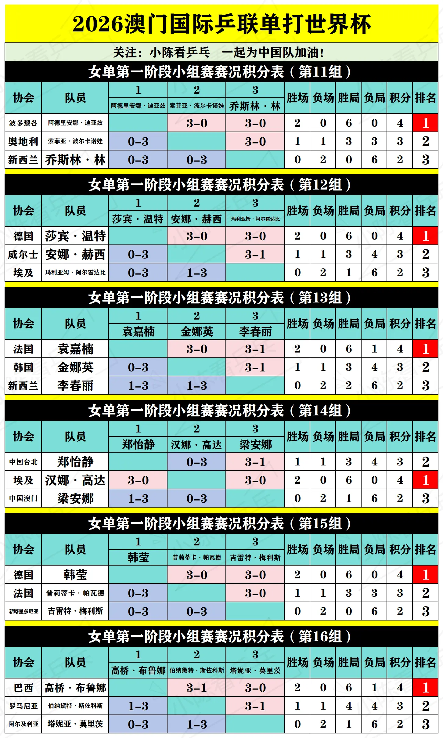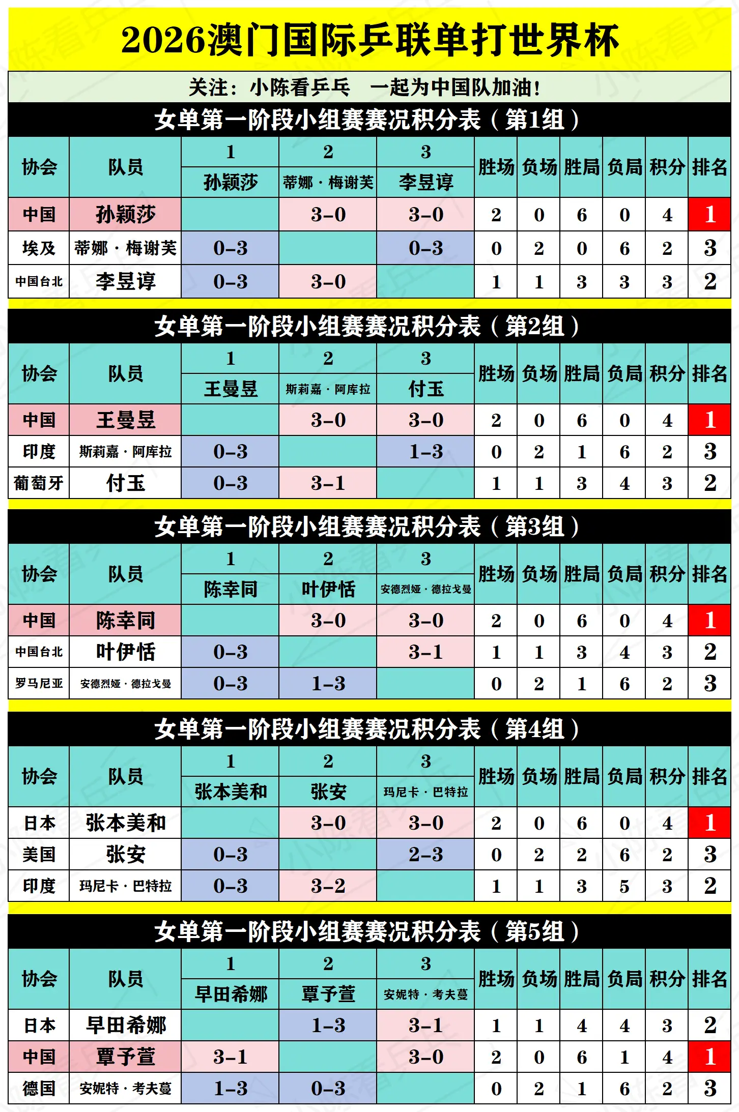 2026澳门单打世界杯小组赛积分表完整版。2026澳门单打世界杯小组赛积分表完整版,小组循环赛全部完成,男女单各16名队员晋级淘汰赛,中国队女单6名队员全部晋级(孙颖莎、王曼昱、陈幸同、蒯曼、王艺迪、覃予萱),男单仅王楚钦和温瑞博晋级淘汰赛,中国队继续加油。