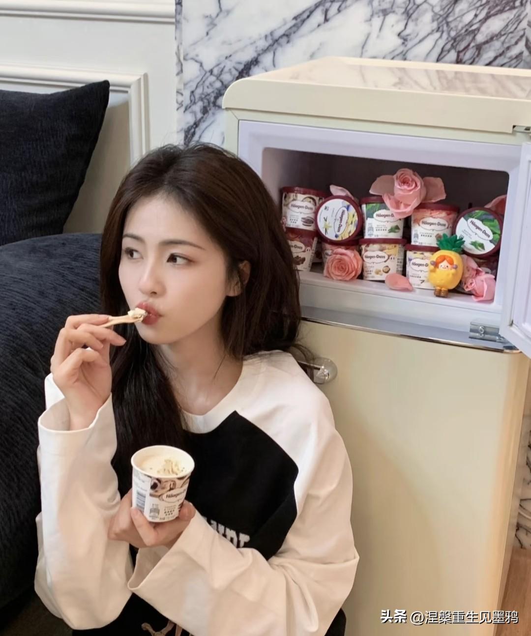 白鹿复古小冰箱放满的冰激凌 白鹿正坐在沙发旁,一手拿着哈根达斯冰淇淋杯,一手用木勺送入口中,神情自然放松。她身穿黑白拼色长袖上衣,长发随意披肩,身旁是一台米白色复古小冰箱,门敞开着,里面整齐摆满各色冰淇淋,还点缀着粉色玫瑰和可爱玩偶,整体氛围温馨又生活化,像极了周末宅家享受甜品的日常瞬间,整个照片十分接地气。