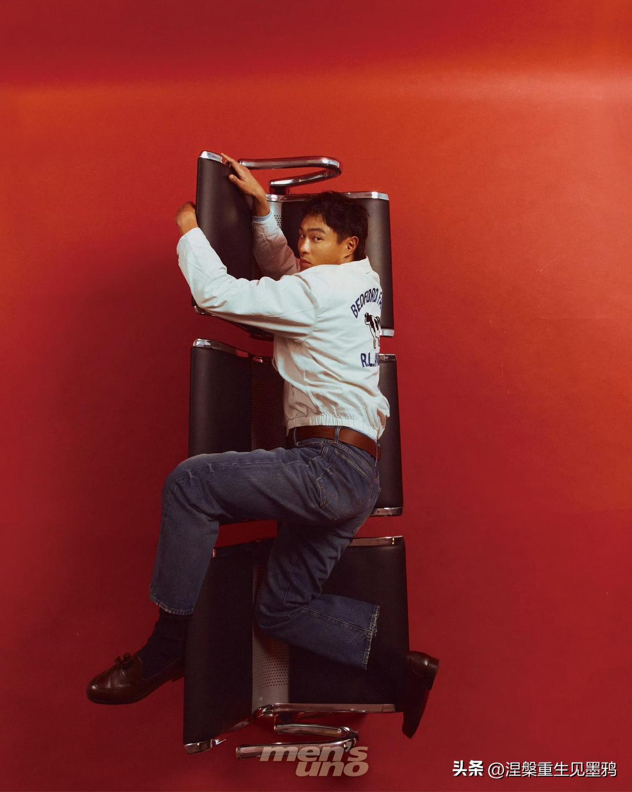 杨祐宁 mensuno tw 4月封杂志释出,最有意思的一张是他双腿往黄线两边一岔,一只手摸着后脑勺挠头发或扶墙,另一只手插在口袋不知道干嘛,活脱脱就是酒局散场后,喝到微醺的大哥找不到厕所,靠着墙根在那“占地盘”。 杨祐宁上身穿着一件米白色翻领夹克,后背印有蓝色弧形字样“BEDFORD FARM”、一头黑白花奶牛图案和蓝色的“R.L.AND CO.”字样;下身搭配经典水洗蓝直筒牛仔裤,裤腰系着一条棕色牛皮腰带,脚上穿一双深棕色休闲皮鞋,整体穿搭是美式休闲风格,简约又充满氛围感,错位的站位也让这张背影照生出了不少有趣的联想。