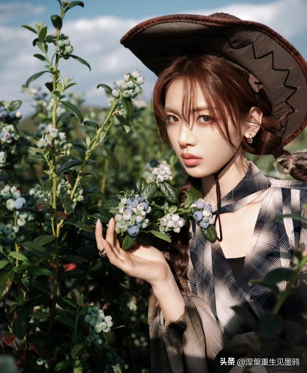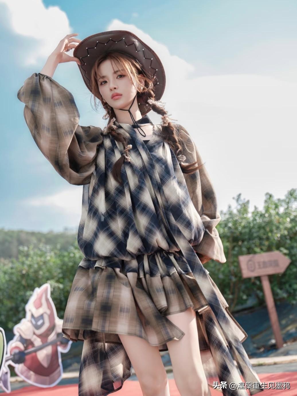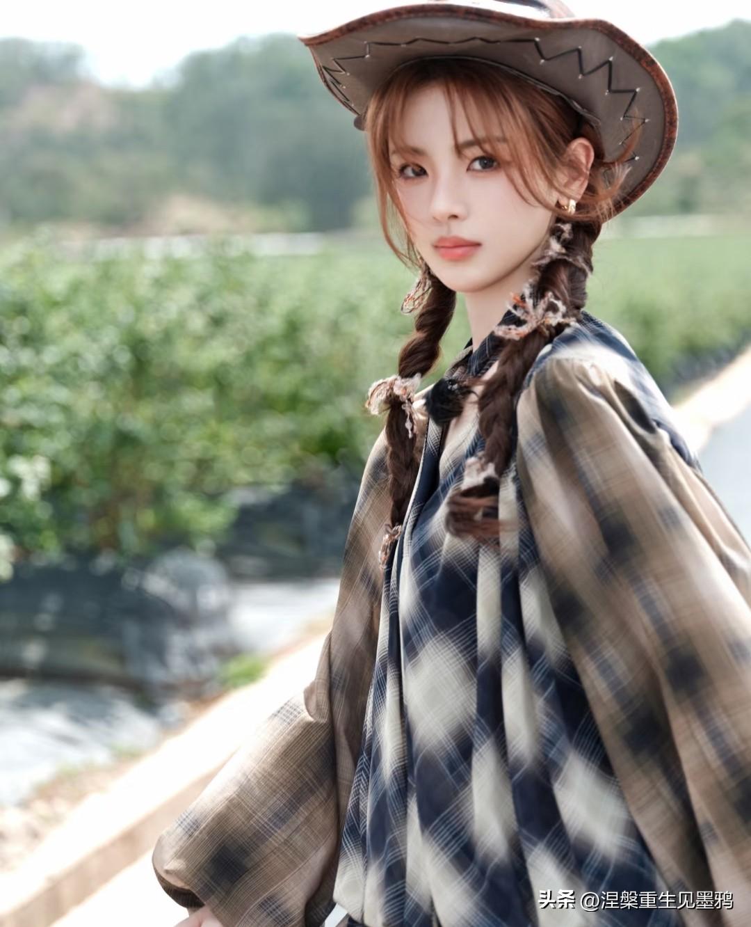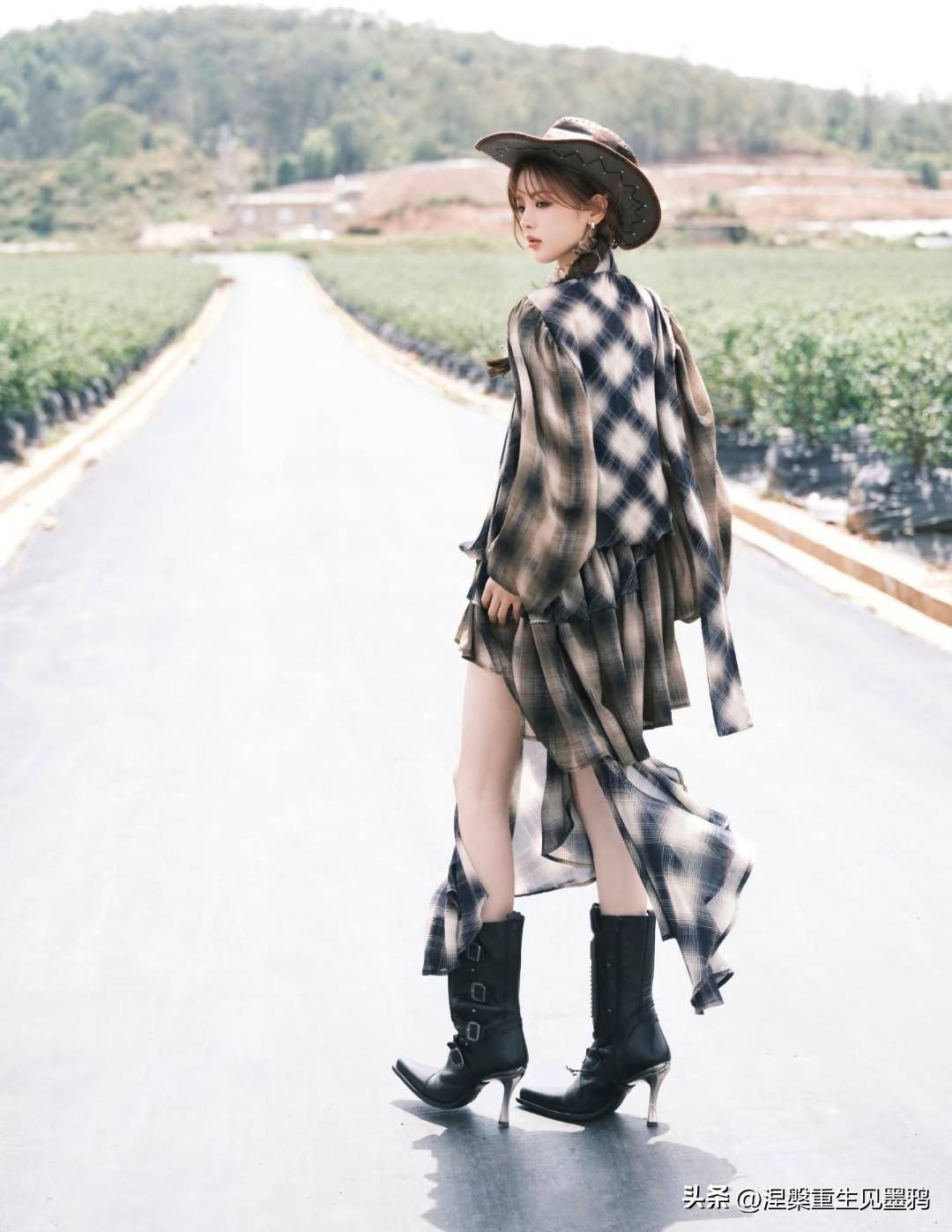 杨超越这一记回眸,把西部牛仔的野性和都市摩登的精致揉得刚刚好。 她戴着做旧质感的宽檐牛仔帽,发尾编成两条松散的麻花辫垂在肩头,耳畔的金属耳饰随着转身的动作轻轻晃动。身上那件 oversized 的格纹衬衫裙随风扬起,不规则的下摆露出修长的腿部线条,慵懒中透着随性。 最绝的还是脚下这双黑色高跟靴:尖头设计拉长脚型,鞋筒上的金属扣带增添了几分硬朗帅气,而那个纤细的金属细高跟更是点睛之笔——它让原本粗的牛仔风瞬间多了几分凌厉的女人味。走在乡间小路上,每一步都踩出了气场,回头那一瞬,眼神里带着点漫不经心的酷,仿佛整个旷野都是她的 T 台。