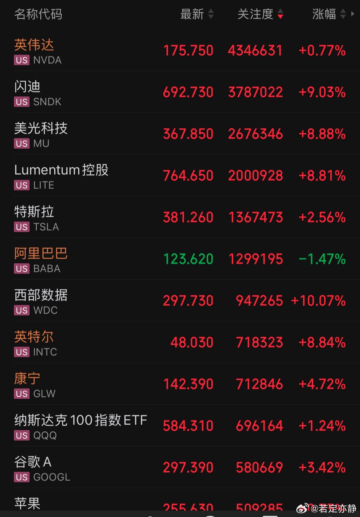大型科技股方面,英伟达涨0.77%,美光科技涨8.88%,英特尔涨8.84%,谷歌A涨3.42%,超威半导体涨3.33%,阿斯麦涨2.95%,特斯拉涨2.56%,Meta涨1.27%,亚马逊涨1.10%,高通跌1.19%。