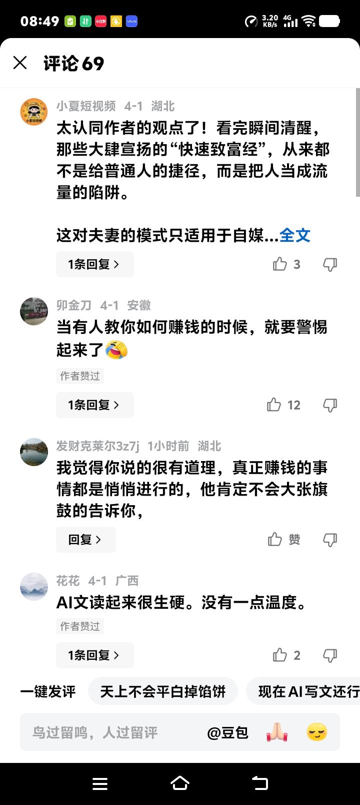 我也曾相信算法无情,数量为王。于是夜以继日地让AI生产,文章像流水线上的罐头,整齐却冰冷,从25年1月25日起洵哥最早的一天生成三五篇,到后来的一二十篇直到现在一天都能完成四五十篇每篇七八百字的文章。结果呢?平台不是傻子,读者更不是。没有灵魂的文字,就像塑料花,一眼就能被识破,最终淹没在信息的洪流里,连一丝水花都溅不起。