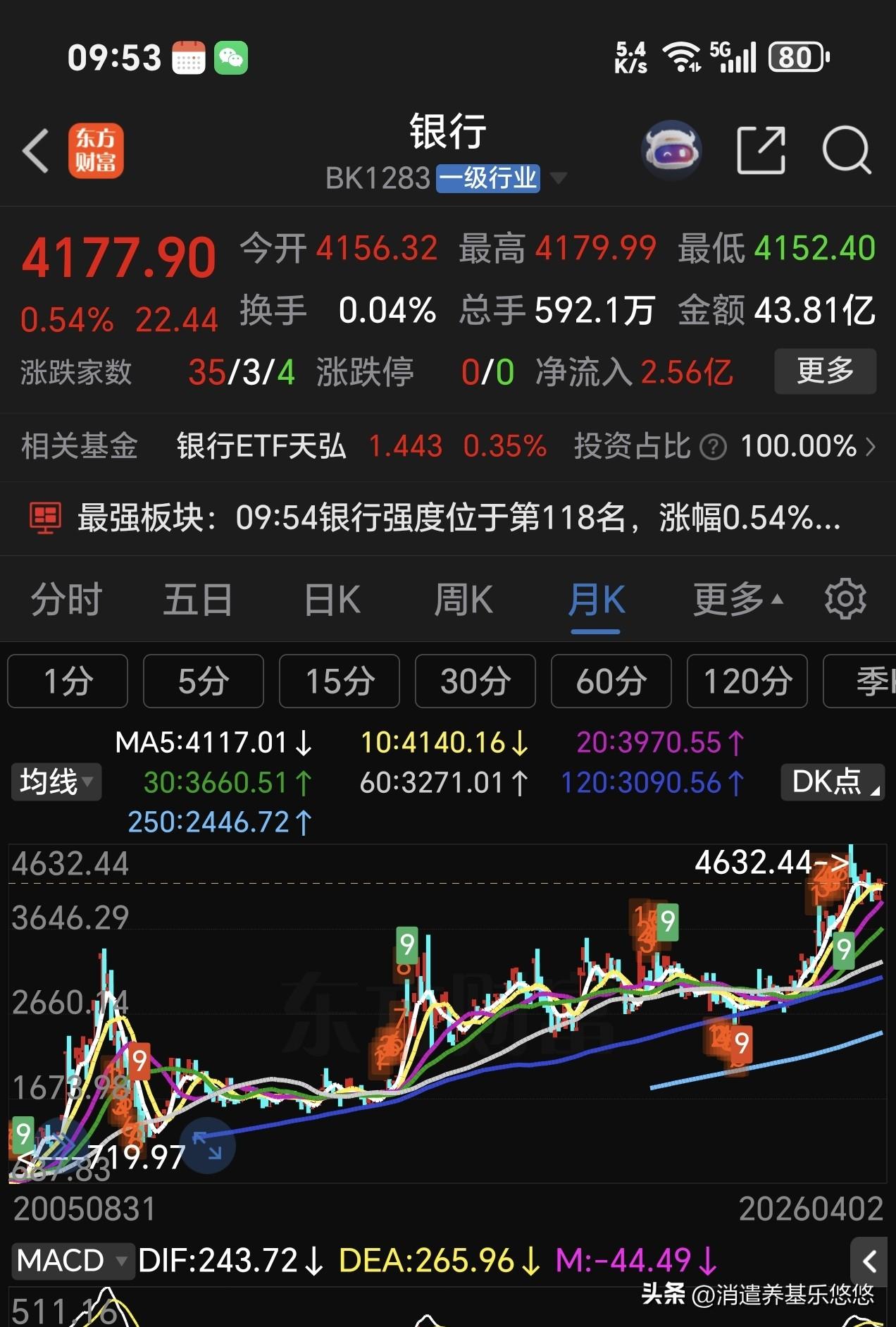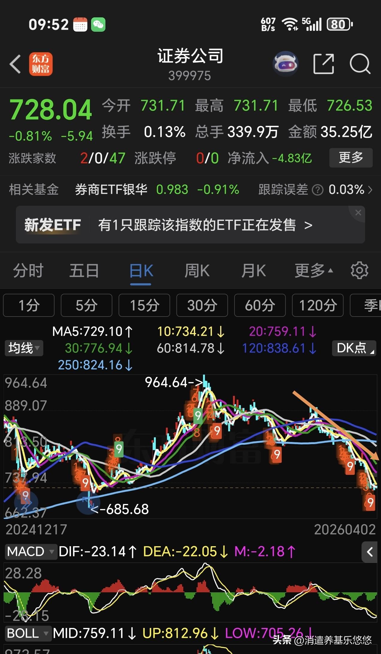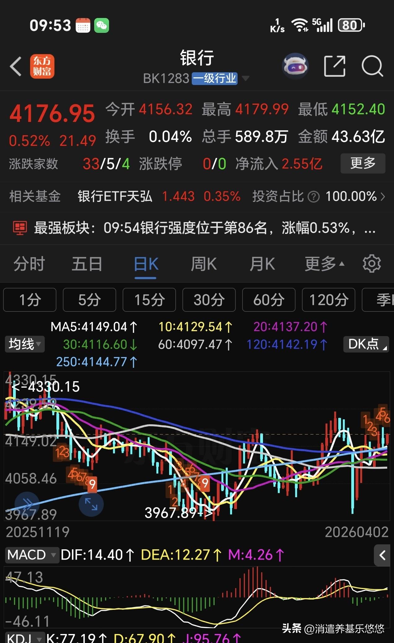 看看这个牛市旗手是这样走的,不停的下跌,大盘涨跌根本与它无关紧要,主力资金已经放弃它了,不要再执迷不悟下去了,26年没有行情,即使有点小行情,也轮不到它,它大幅上涨,那大盘不也就跟着飙升吗?现在是,主力宁可拉升大块头的银行,也不光顾证券。看看银行走势图与证券走势图,明显的是银行强于证券。证券风光不再,你还愿意坚守它吗?