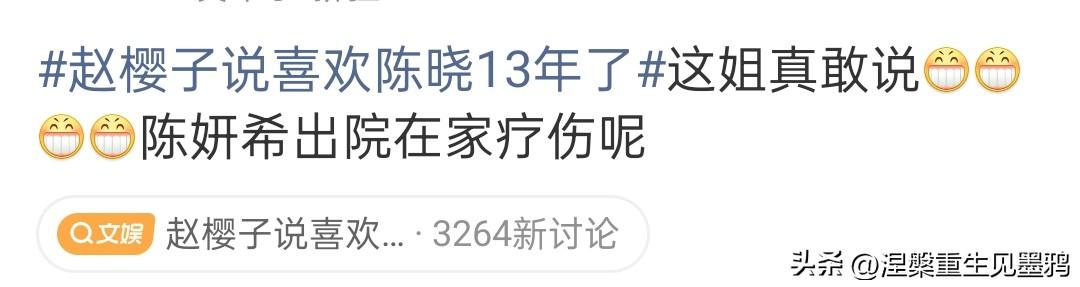 赵赵樱子一句喜欢陈晓13年上了热搜,而陈妍希出院的热搜也有了热度,两条时间线挨得极近的热搜,瞬间把瓜友的八卦DNA炸了出来 先看赵樱子这边,节目录制现场大大方方一句“喜欢陈晓13年”,坐实了网友给她贴的“真敢说”标签。算一算时间,13年前刚好是陈晓凭借《神雕侠侣》杨过一角爆火的时候,那个剑眉星目带着少年英气的古装演员,确实是不少人少女时代的“白月光”。有人说赵樱子这是坦荡,把藏了十几年的心事说出来,不留遗憾;可更多网友第一反应就是不对:陈晓早就和陈妍希成家,孩子都长大了,昨天陈妍希刚出院,今天你就说喜欢人老公13年,这时间点凑得也太巧了,很难不让人多想。 有人翻出去年陈妍希和陈晓的婚变传闻,对着这次的两条热搜拉郎配,编出了一整套“家里老婆刚养好身体,外头就冒出暗恋者”的大戏,说得有鼻子有眼;也有清醒党劝大家别硬加戏,说赵樱子本来就走“直爽敢说”的路线,喜欢本来就是很正常的事,圈里人欣赏优秀同行太正常,别什么都往感情纠纷上扯。 其实说白了,哪有那么多巧合的瓜,大多不过是娱乐圈流量逻辑下的结果。对赵樱子来说,说一句心里话换一个热搜,性价比确实高;可对陈晓和陈妍希来说,平白无故被扯进狗血八卦,本来就和他们无关的事情,却要被迫承受舆论的指指点点,实在是无妄之灾。