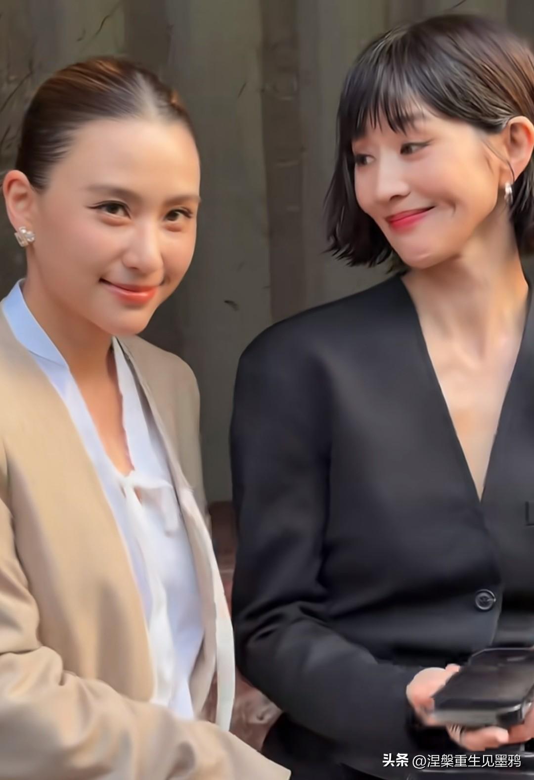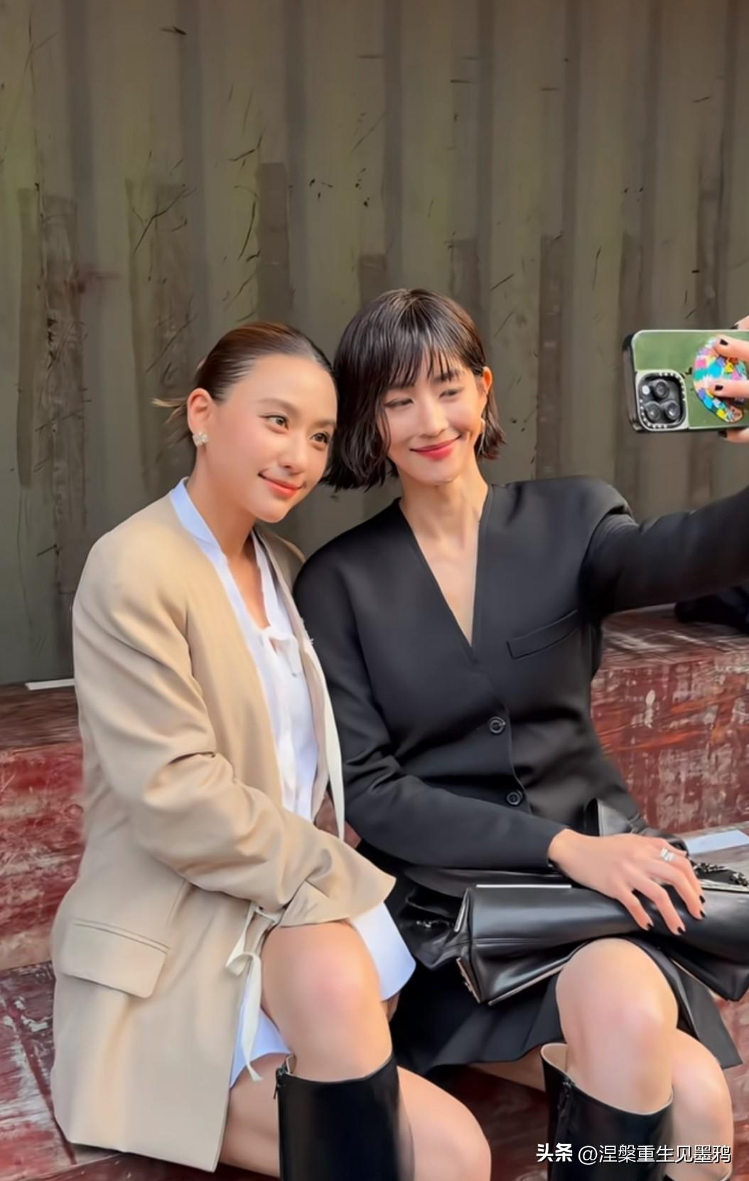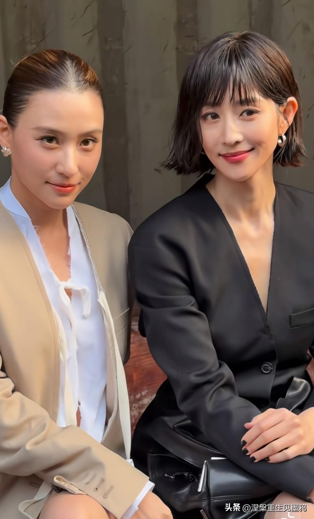 何超莲张钧甯同框合影 何超莲梳着利落的高颅顶贴发扎发,露出饱满的额头,珍珠耳钉藏在鬓角旁,衬得她气质温柔又舒展。她选了奶杏色休闲西装叠穿米白系带衬衫,深浅柔和的配色自带松弛氛围感,正式又不紧绷,恰好匹配这场活动的调性。张钧甯换了新的齐颈短发,空气刘海贴服在额前,同风格的珍珠耳饰呼应同伴的搭配,一身纯黑深V西装裙恰好中和了短发的娇俏,显得干练又大气,深V领口恰到好处露出肩颈线条,把她长期运动的优越骨架衬得愈发好看。 一个浅暖一个深黑,一浅一深的撞色搭配刚好平衡了画面,两个人靠着坐在一起,肩贴肩的距离衬得熟络又自然。张钧甯笑着举着手机找角度,何超莲顺势把肩膀靠过去,两个人都对着镜头弯起眼睛,暖融融的阳光落在身上,连衣料的纹理都透着松弛的好友感。
