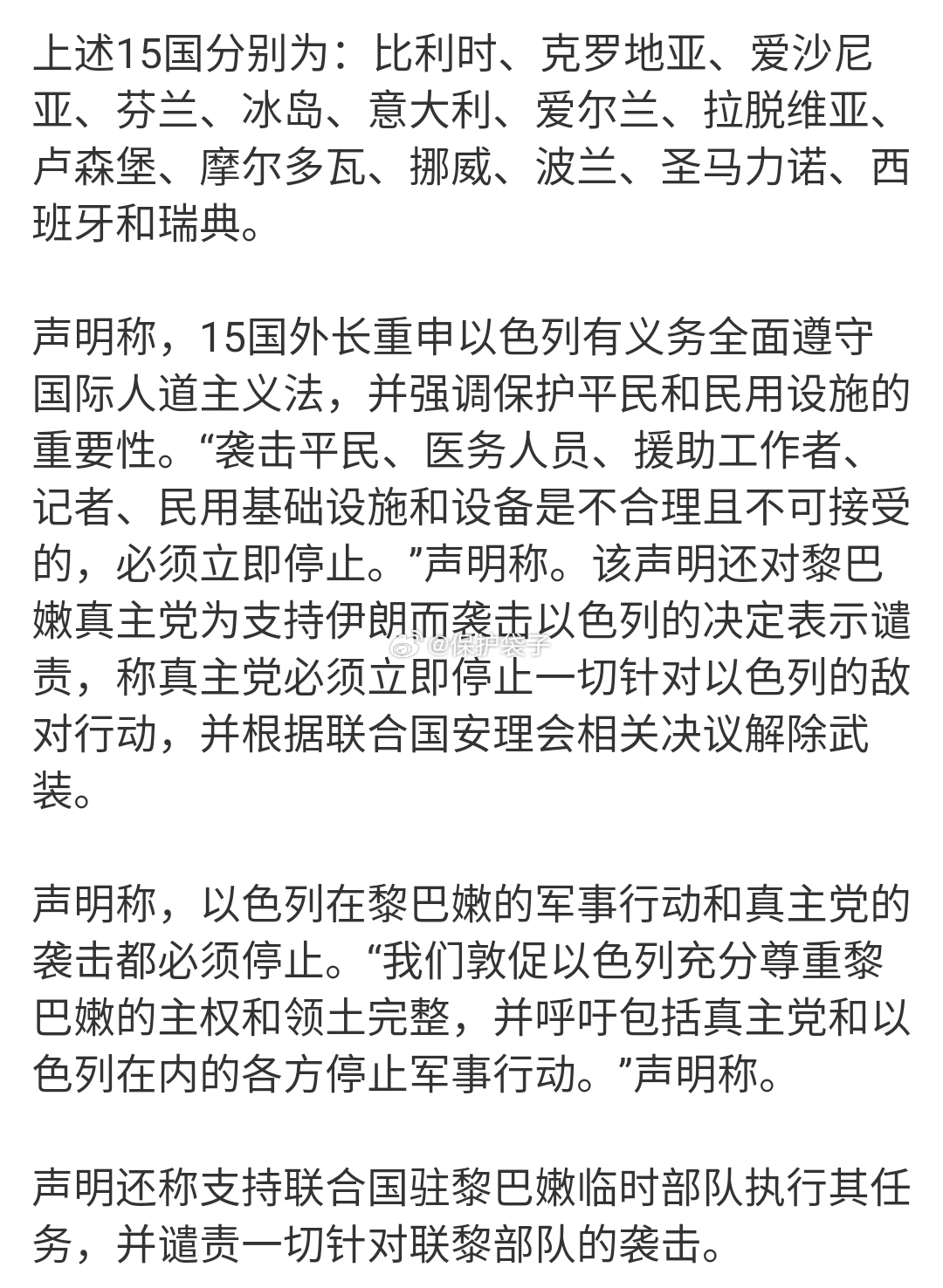 15国外长联合声明想起一个场景:一群小孩子在玩的时候,其中一个仗着更高大的哥哥按住另一个在地上摩擦。然后这群小孩子围在边上一个劲动嘴说“你们不要打啦”。 对事实有影响么? 该听的人能听进去么? 这群小孩可能可以拉开站着的那个,但面对更高大的哥哥时候,能不怂么? 所以,15国这是来秀存在感的?袋子时评