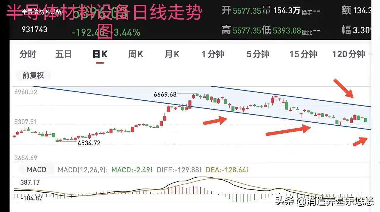 半导体材料设备今天大跌超4%,在半导体系列中跌幅居前,目前看,没有止跌迹象。下面是它的日线及周线走势图,周线已经跌破了通道下沿支撑,近期收不回来,恐怕要继续下跌。日线走势也是处于下跌通道中,不知道何时能止跌企稳。 半导体材料设备是大家比较看好的板块,它的半导体芯片国产替代主要环节之一,国家大力支持发展,国家大基金也给予照顾,可是它不争气,市场表现不尽人意。目前对它要么割肉走人,要么躺平不动。