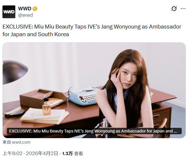 张元英成为Miu Miu Beauty日本、韩国品牌大使 ,好厉害👍