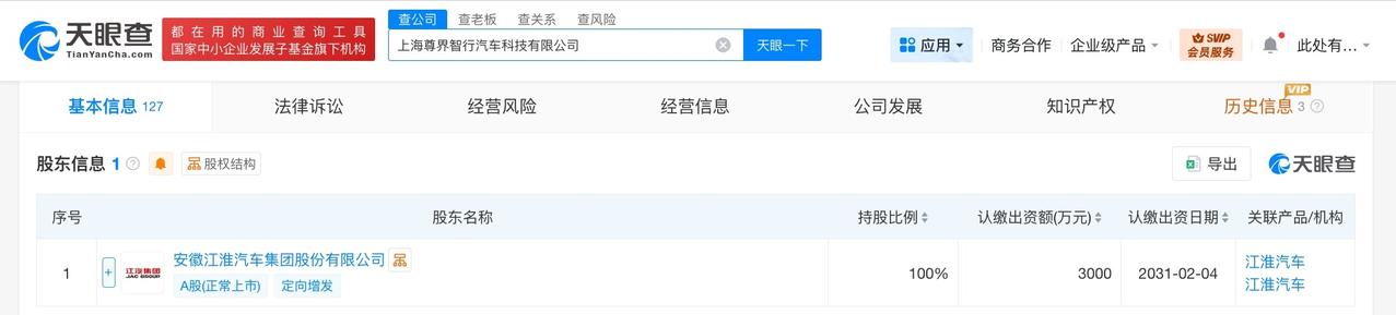 江淮汽车在上海成立尊界智行公司 注册资本3000万 天眼查工商信息显示,4月1日,上海尊界智行汽车科技有限公司成立,法定代表人为舒洁,注册资本3000万人民币,经营范围为汽车零部件研发,技术服务、技术开发、技术咨询、技术交流、技术转让、技术推广。股东信息显示,该公司由江淮汽车(600418)全资持股。 天眼查信息:
