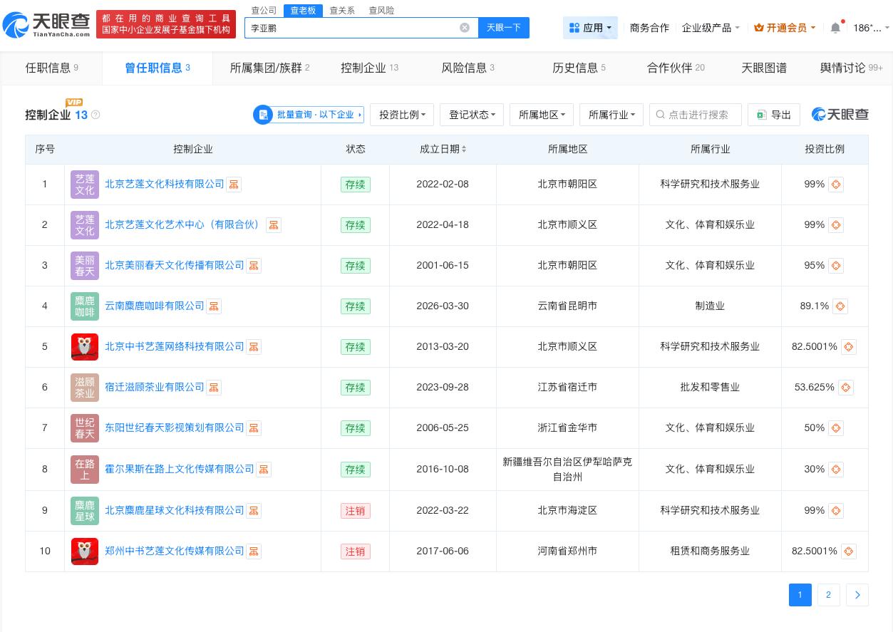 李亚鹏名下公司涉及多个领域 李亚鹏控制13家企业张雪想卖陈光标赠送豪车给嫣然捐款 据媒体报道,4月2日,机车品牌创始人张雪回应陈光标赠予其一辆价值1300万元劳斯莱斯一事。张雪表示,若赠予属实会将全部所得款项捐赠给嫣然天使基金。 天眼查App显示,李亚鹏名下关联9家企业,其中8家处于存续或正常状态,包括丽江雪山投资有限责任公司、北京市朝阳区嫣然天使儿童医院、北京中书艺莲网络科技有限公司等,李亚鹏在上述企业担任法定代表人、董事长等职务,版图涉及投资、医疗、影视文化等领域。控制企业信息显示,李亚鹏控制13家企业,涉及云南麋鹿咖啡有限公司、北京中书艺莲网络科技有限公司等公司。 天眼查信息:-c756981847