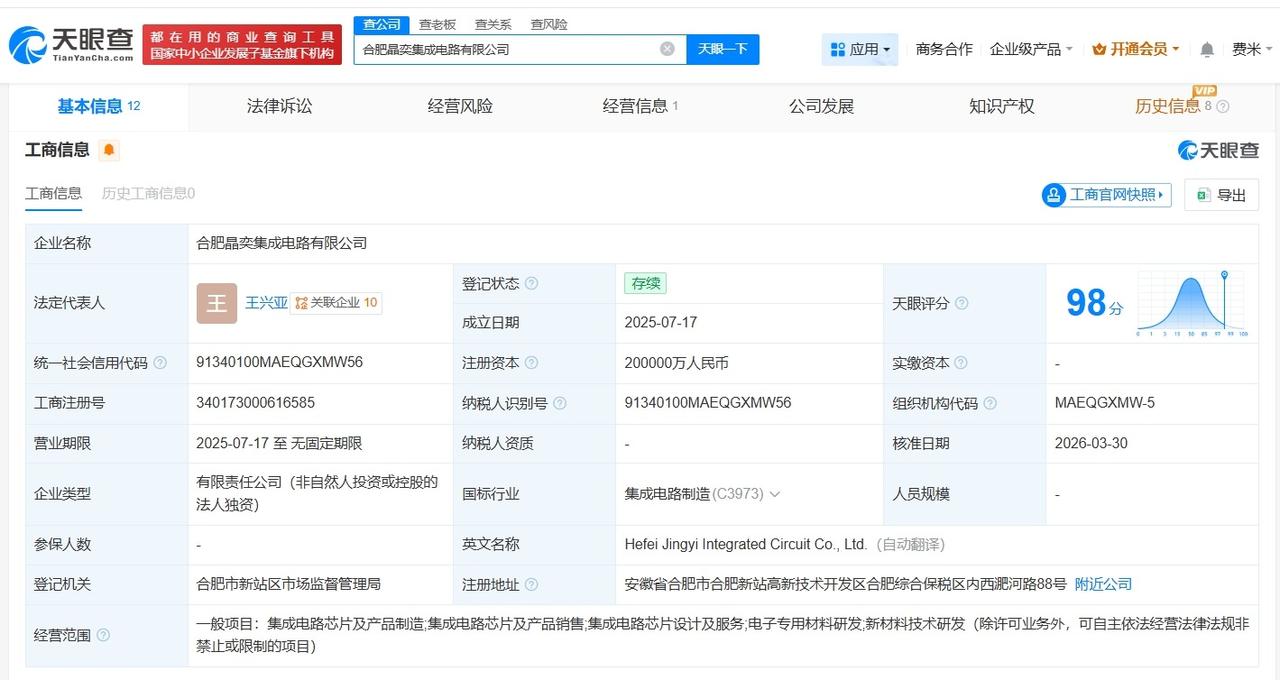 晶合集成旗下晶奕集成电路公司增资至20亿 增幅9900% 天眼查App显示,近日,合肥晶奕集成电路有限公司发生工商变更,原股东合肥芯航企业管理合伙企业(有限合伙)、合肥晶策企业管理有限公司退出,新增晶合集成(688249)为全资股东,同时,注册资本由2000万人民币增至20亿人民币,增幅9900%。 该公司成立于2025年7月,法定代表人为王兴亚,经营范围包括集成电路芯片及产品制造、集成电路芯片及产品销售、集成电路芯片设计及服务等。 天眼查信息:
