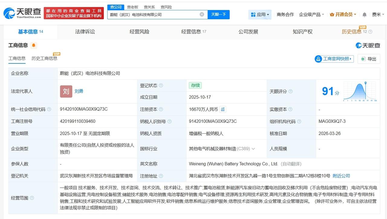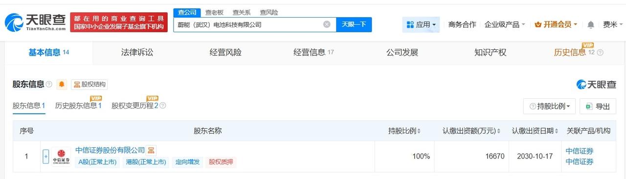 中信证券接手蔚能旗下武汉电池科技公司 天眼查App显示,近日,蔚能(武汉)电池科技有限公司发生工商变更,原股东武汉蔚能电池资产有限公司退出,新增中信证券(600030)为全资股东,同时,赖晓明卸任法定代表人、董事、经理,刘勇接任法定代表人、董事,王洲接任经理。 该公司成立于2025年10月,经营范围包括蓄电池租赁、新能源汽车废旧动力蓄电池回收及梯次利用、电动汽车充电基础设施运营等。 天眼查信息: