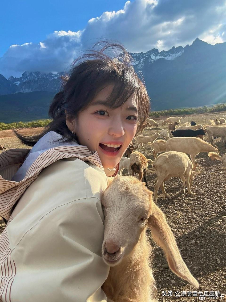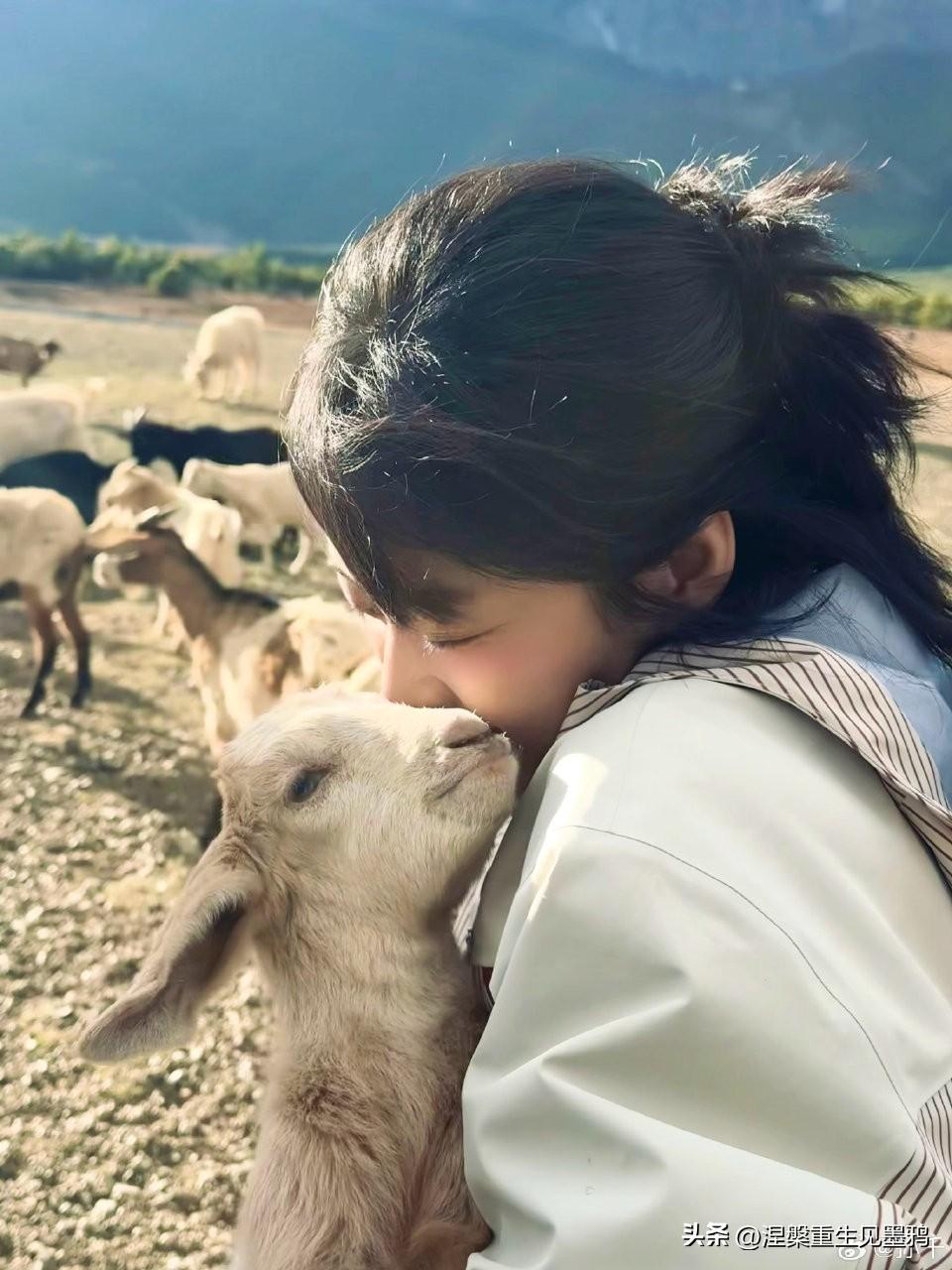 孙千回眸留下了纯真感 孙千她侧身回头对着镜头,嘴角大大张开露出牙齿,眼睛弯着带笑,情绪鲜活生动。她穿带条纹帽边的米白色连帽外套,几缕碎发被山风吹起,自然松弛又充满感染力。一只浅米色的美利奴绵羊将头亲昵地靠在她肩膀上,半眯着眼模样温顺软萌,和孙千的互动十分有爱,整个画面充满了纯真。