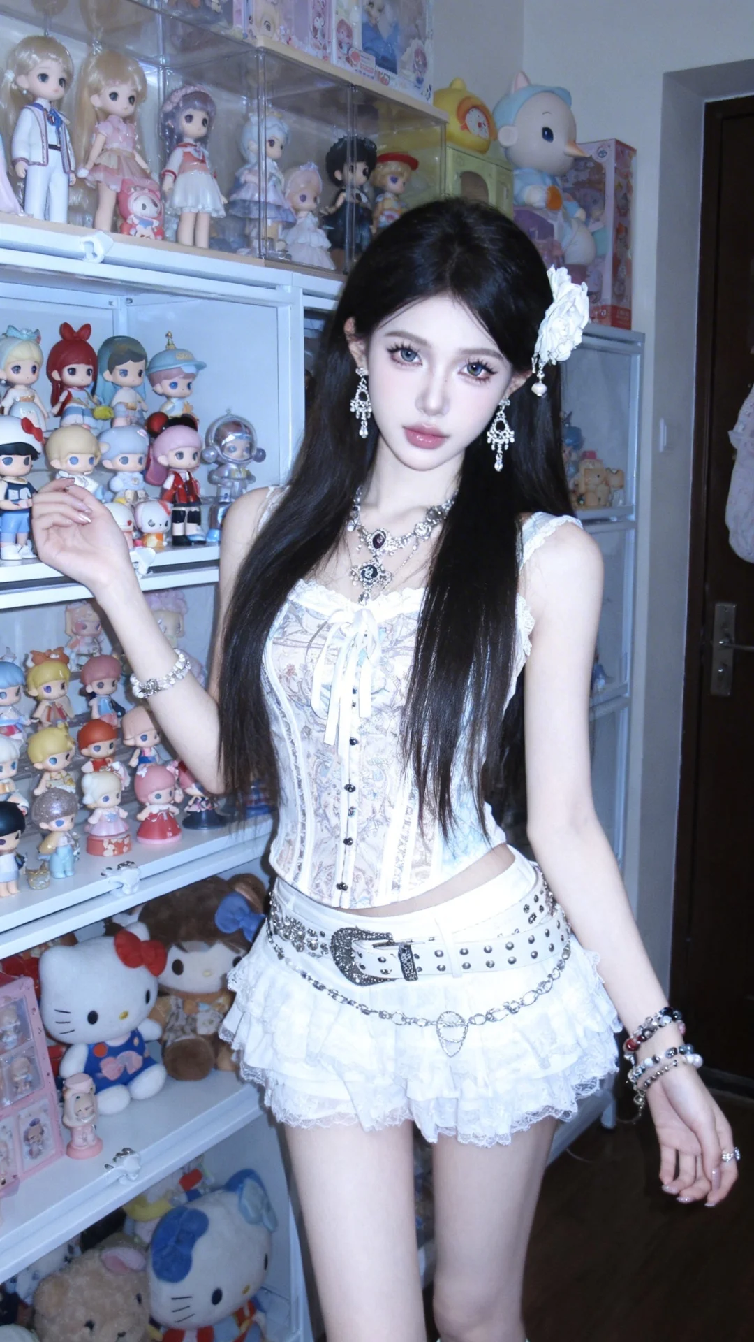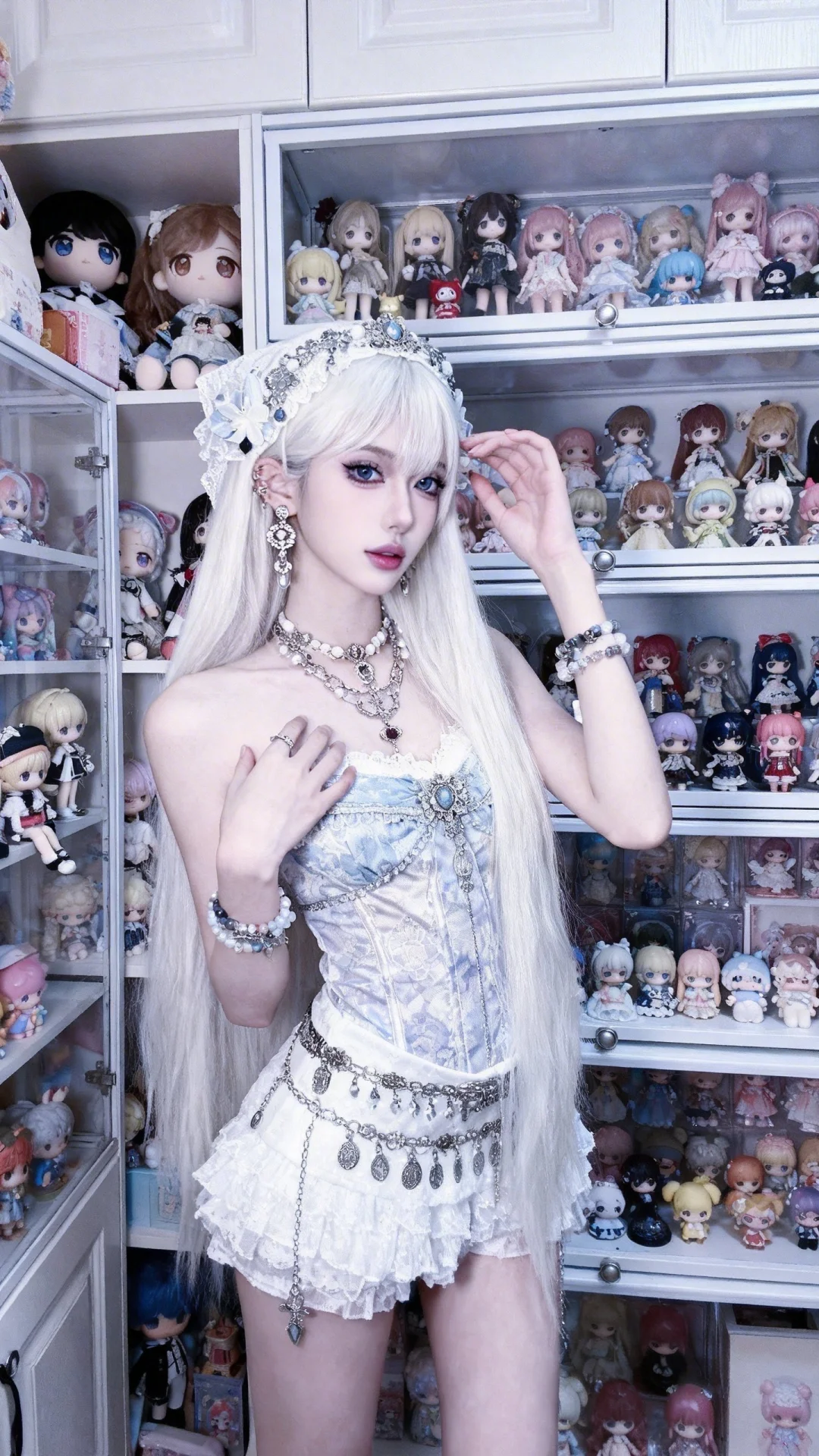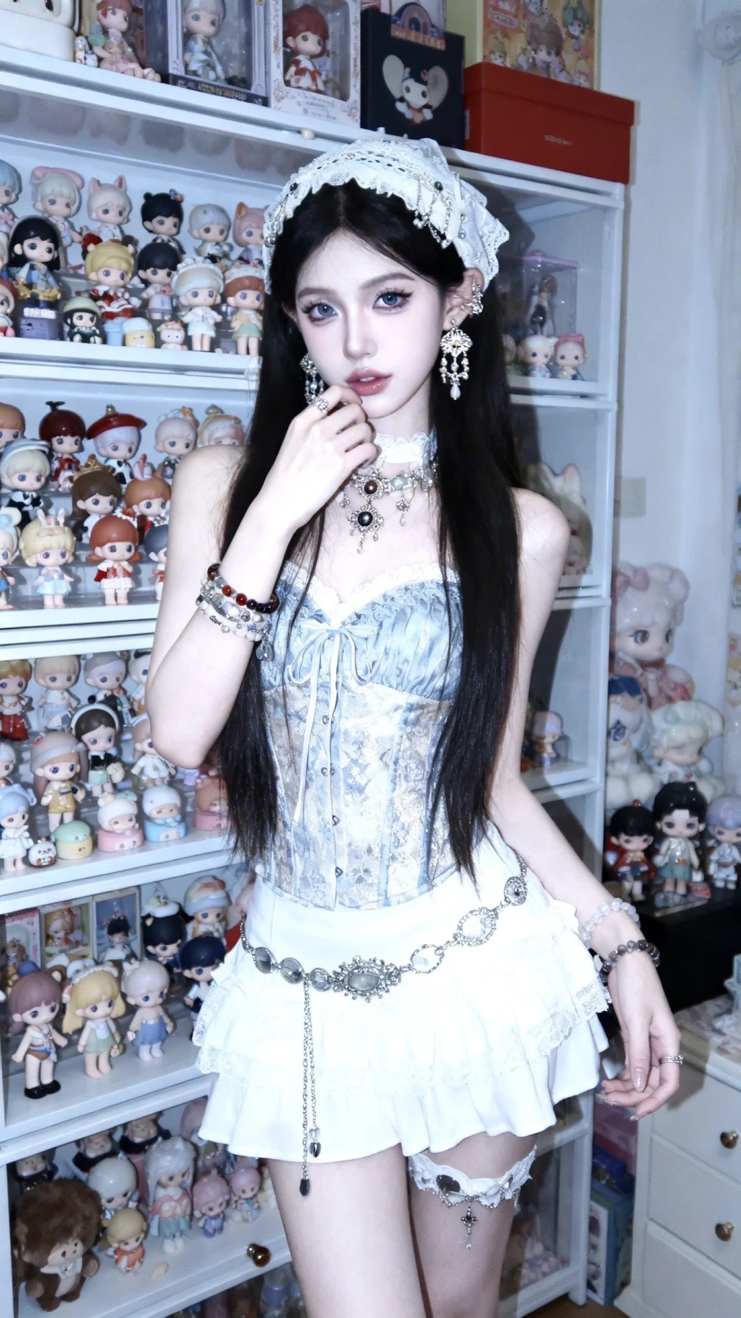 精心布置满满可爱手办的屋子整齐干净,网红头像氛围感,宿命感氛围感,情绪流氛围感,可爱氛围感,微微曝光,微微朦胧感,复古氛围感,古早风味。绝世美女,冷白皮白瓷皮,高鼻梁高山根精致脸骨相感美女,网红美女氛围感,精致复杂设计感可爱日常服饰,不显示“nunu”这个词, 精致复杂设计感日常配饰首饰耳饰头饰手饰,美女全身入境,动作自然,美女身材纤细娇小,长发,网红妆可爱系浓妆妆感真实质感清透裸妆感真实质感,整体色调丰富搭配和谐。
