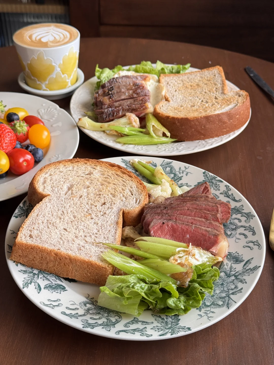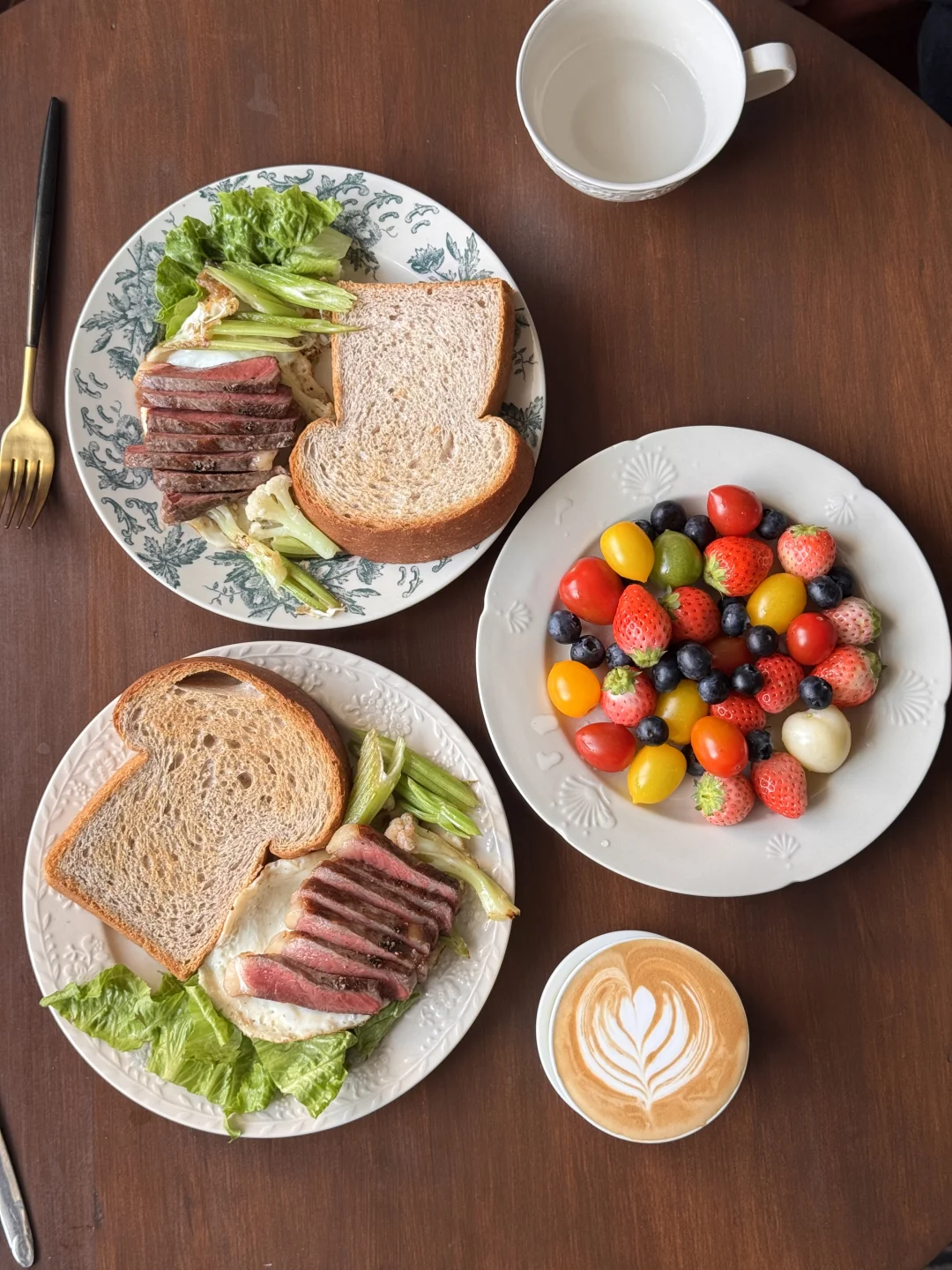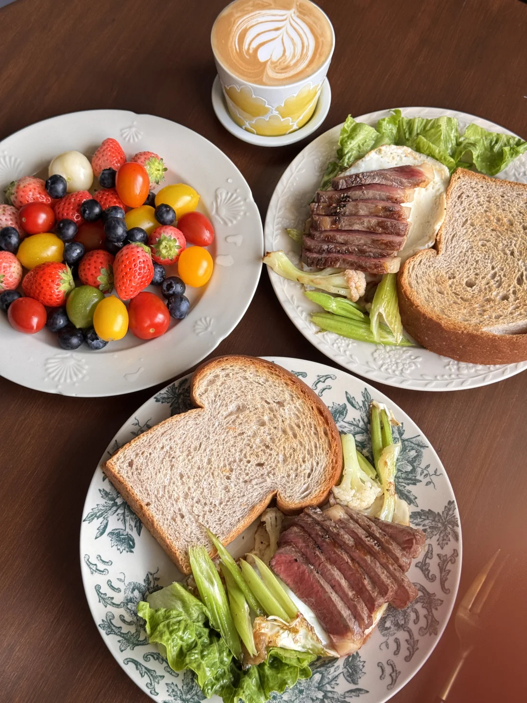 🍞主食: 软乎乎的黑麦吐司,麦香超浓,咬一口都是扎实的幸福感 🥩蛋白质: 完美的五分熟牛排,切开是漂亮的粉粉嫩嫩,搭配煎蛋,一口下去超满足! 🥬蔬菜: 清炒西芹+花菜+生菜,清爽解腻,给整餐加了满满的膳食纤维 🍓水果: 草莓+蓝莓+多彩小番茄,色彩拉满,酸甜解腻,每一口都是春天的味道 ☕饮品: 一杯拉花拿铁,家属一杯清润的白水,解腻又健康