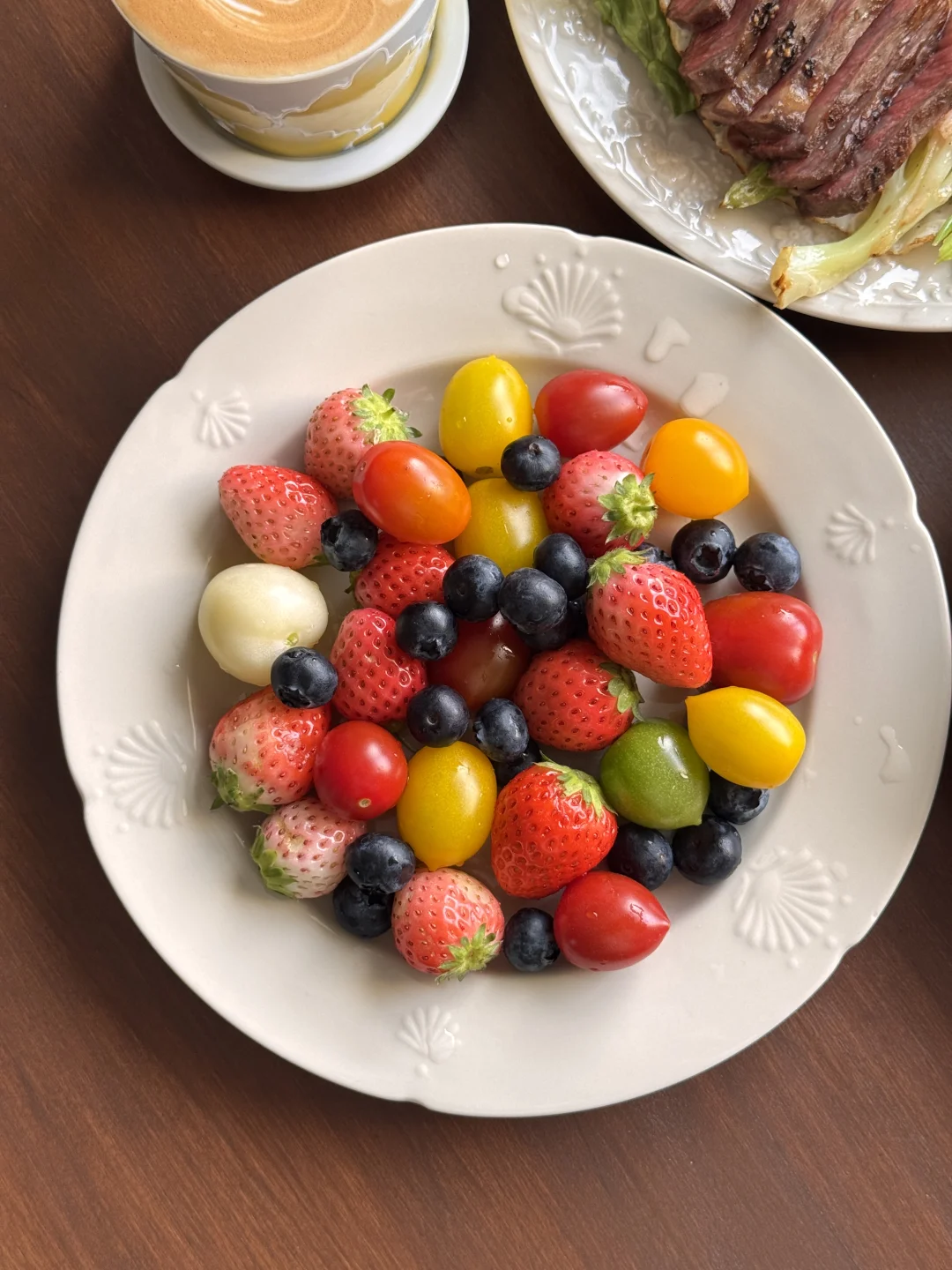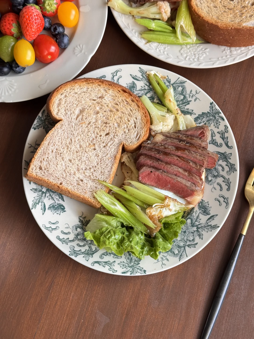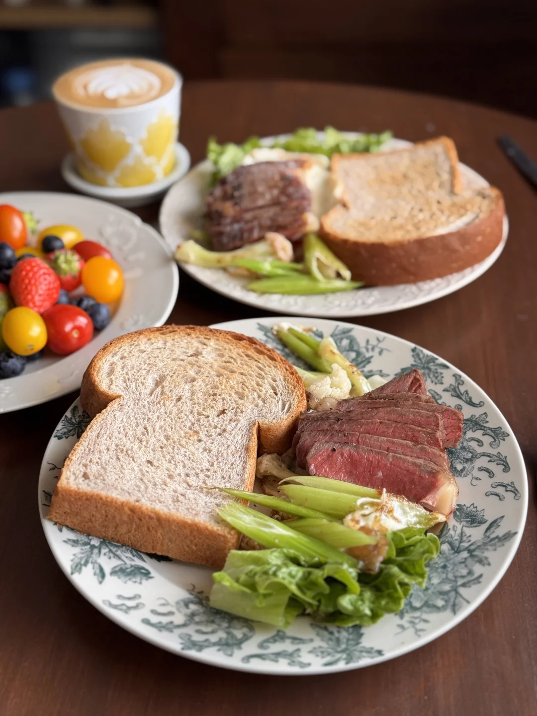 🍞主食: 软乎乎的黑麦吐司,麦香超浓,咬一口都是扎实的幸福感 🥩蛋白质: 完美的五分熟牛排,切开是漂亮的粉粉嫩嫩,搭配煎蛋,一口下去超满足! 🥬蔬菜: 清炒西芹+花菜+生菜,清爽解腻,给整餐加了满满的膳食纤维 🍓水果: 草莓+蓝莓+多彩小番茄,色彩拉满,酸甜解腻,每一口都是春天的味道 ☕饮品: 一杯拉花拿铁,家属一杯清润的白水,解腻又健康