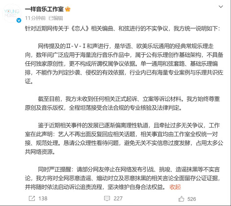 李荣浩工作室回应李荣浩方回应恋人编曲抄袭争议 针对《恋人》编曲、和弦相关争议,李荣浩工作室发布正式回应:网传提及的II-V-I和声进行,是乐坛通用的经典常规乐理走向,属公有乐理创作基础架构,不具备任何独家原创性,无法作为抄袭、侵权的有效判定依据。“截至目前,工作室未收到任何相关正式起诉、立案等诉讼材料,始终尊重原创及音乐版权,将全程坦荡接受合法合规的专业核验与法律判定。”工作室表示,艺人不再出面回应相关话题,相关事宜由工作室统一规范处理,并将对造谣言论留存证据、依法追责。李荣浩方回应