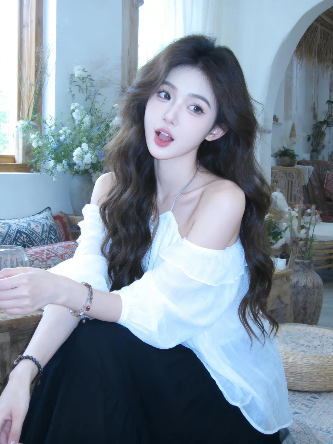 波西米亞風格的傢俱裝飾、植物、花卉、精緻的燈光、4K、个子高挑的女生,一位长发大波浪精致女孩,穿着白雪纺衫黑色长裙,坐着看书,整体氛围清新甜美,高度,