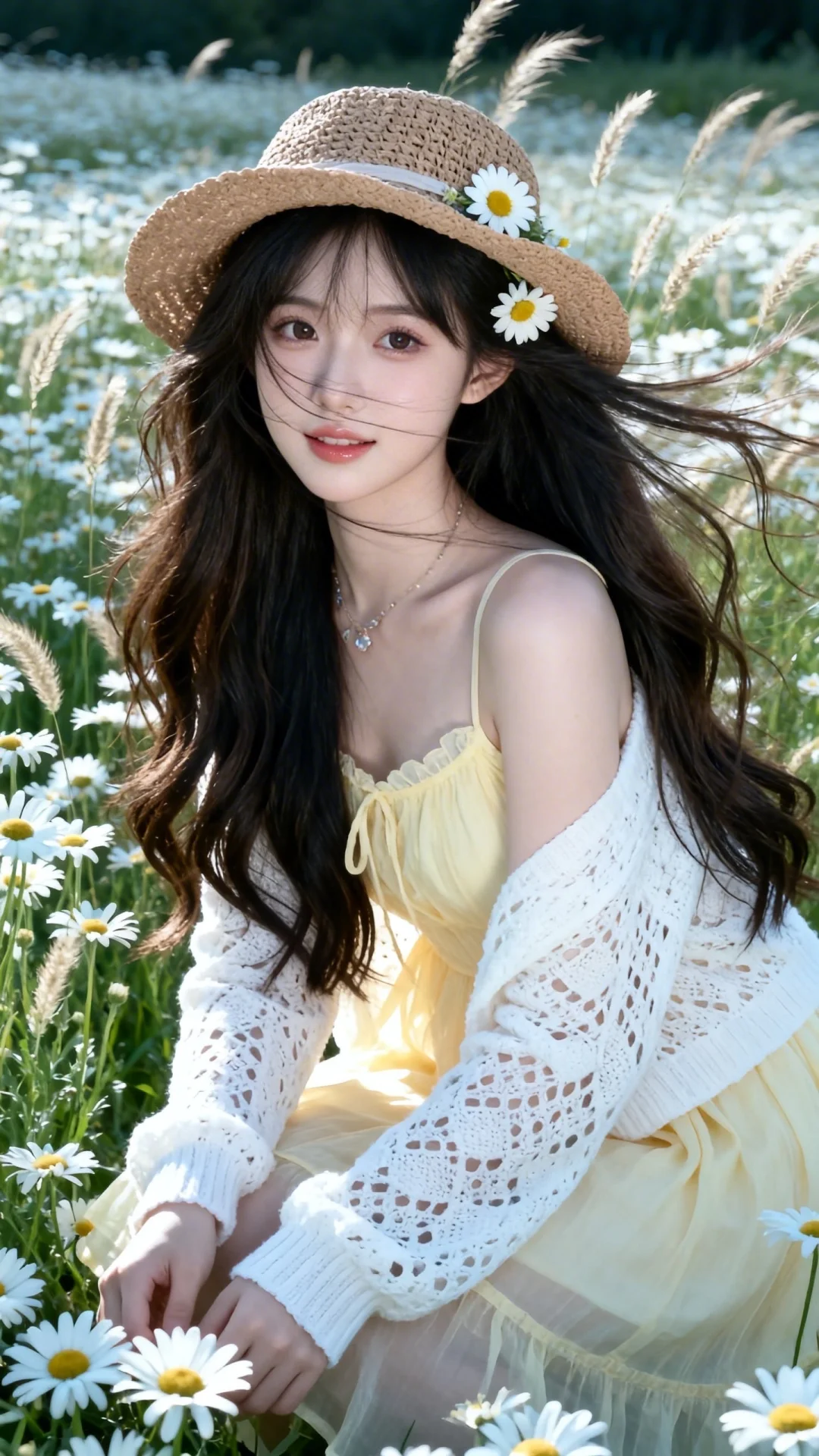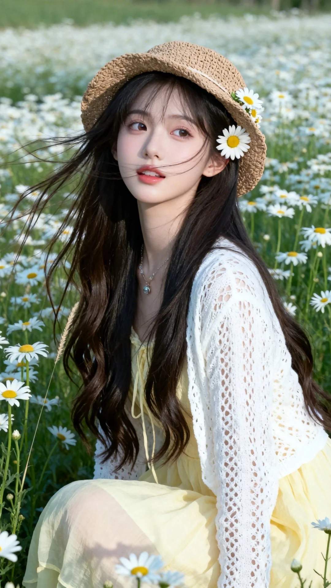 穿搭(淡黄色薄连衣裙、白色镂空针织开衫、浅棕编织礼帽)、装饰(雏菊发饰)