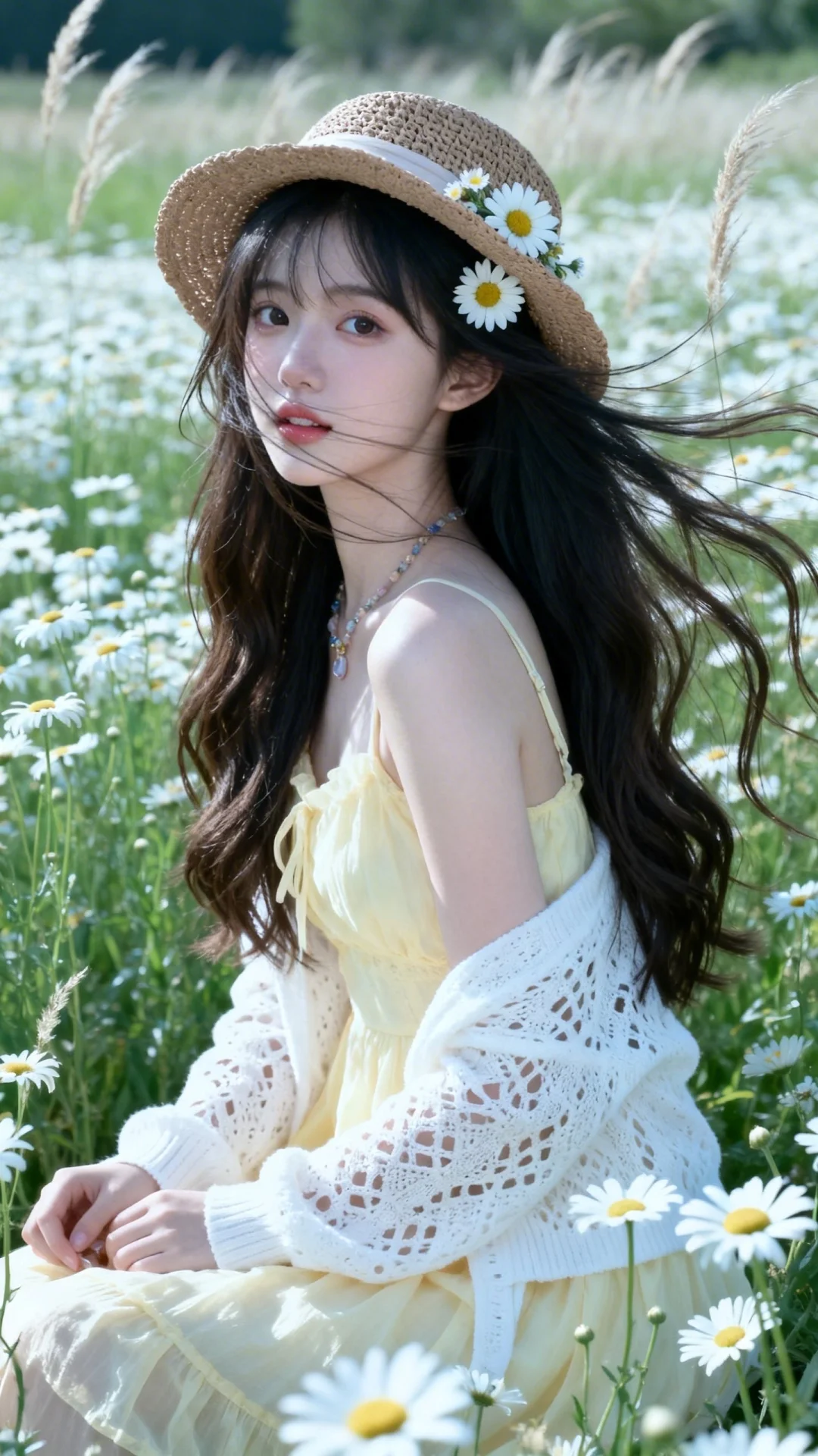 随机优美自然风光场景(夏日郊外花田、雏菊花海铺展、微风晃着花穗、空气裹着清甜花香、暖阳漫过裙摆)。(电影级面光:1.6),(光线追踪:1.5),(冷白皮漫感质感的光滑皮肤:1.7),(人物有最好的骨相:1.2),(网感脸:1.6),(网感妆:1.6)身材完美,莫兰迪配色,高颜值网红,INS风,幼态脸,19岁女生尖下巴,三庭五眼比例均衡,身材娇小,细腻陶瓷水嫩肌肤,偏冷白皮,随机的妆容,随机的饰品,随机的动作,侧光,发丝轻飘,凌乱,随机角度拍摄,总体有很多的不确定性,但又好看,