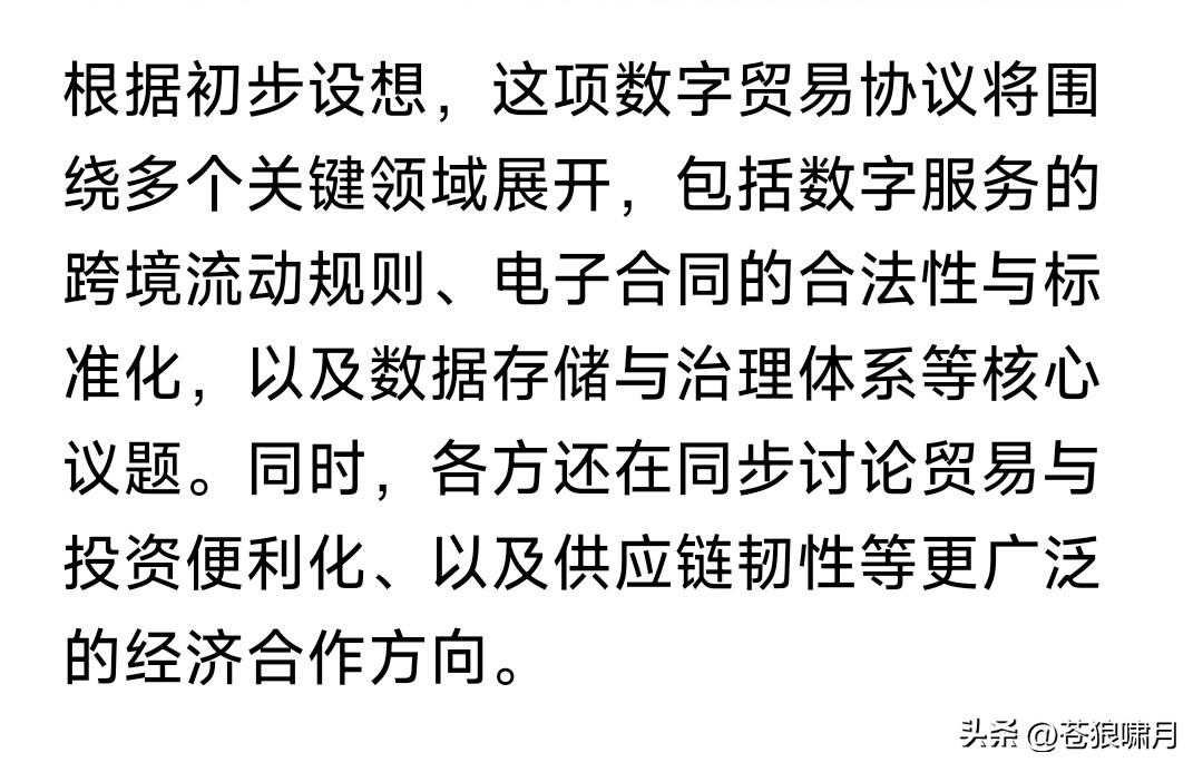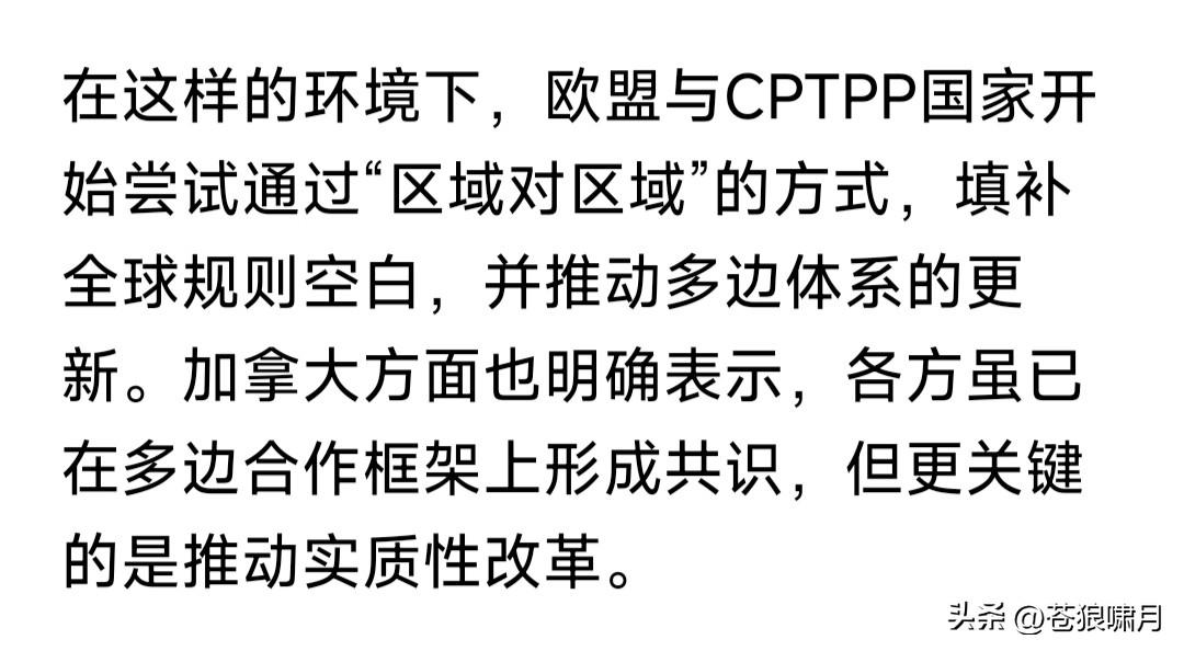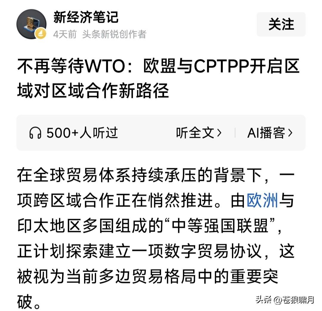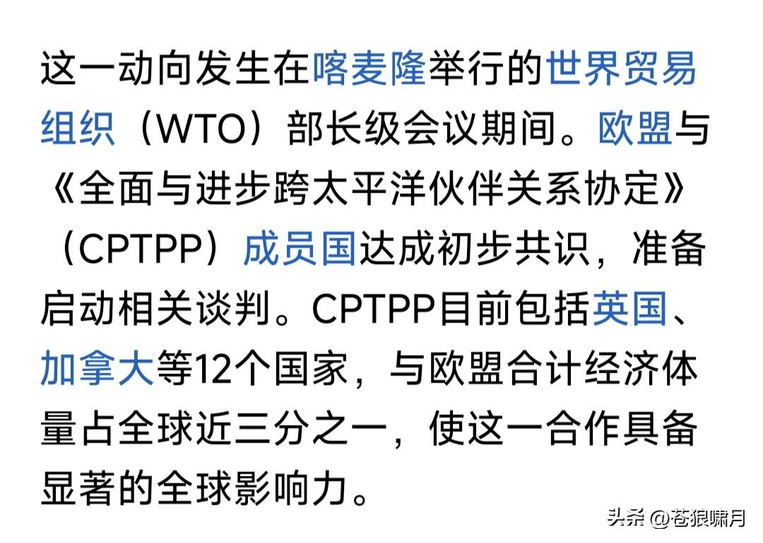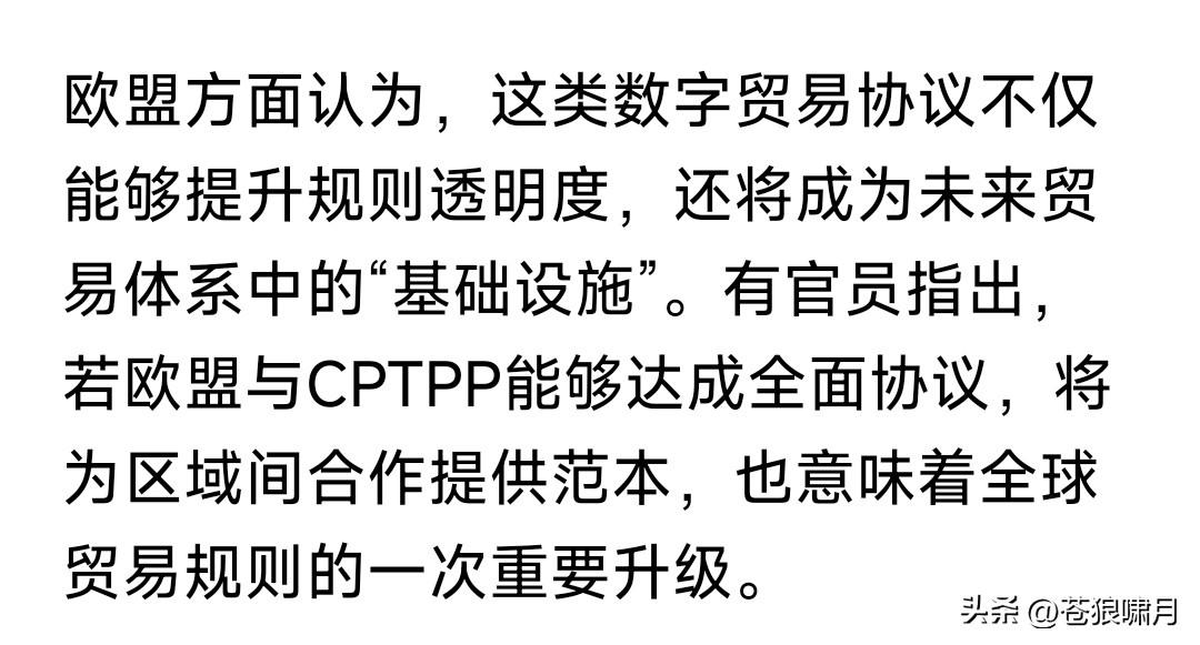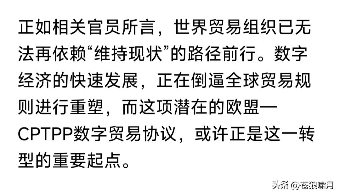 欧盟与CPTPP摆脱WTO,加紧进行数字贸易谈判,应当引起我们重视。 什么叫数字贸易?即贸易往来数字化,包括贸易规则,电子合同的合法性与标准化,数据存储与治理等等内容。 这次谈判意义何在?如果谈判成功,将简化贸易流程,提高贸易效率。目前欧盟27国,加上CPTPP12国,总贸易量已达世界1/3,将对全球产生影响。 其实欧盟早有加入CPTPP愿望,去年就有消息说要加入。这次开始谈判,说明加入进程已经提速,意义重大。 CPTPP又叫环太平洋经济合作组织。起初由美国发起,美国退出后由日澳英加等主导。目前只有12国,但提出申请想加入者很多。中国是其中之一。 目前除了WTO,还有欧盟东盟北美和CPTPP四个经济实力比较强大的地域性经合组织,只有CPTPP跨区域。 鉴于这个原因,CPTPP有可能不断扩大,与其他区域经合组织互联,成为取代WTO的新的世界经合组织。欧盟正在积极加入,其他区域也会跟进! 想起伟人的几句诗:多少事,从来急!天地转,光阴迫。一万年太久,只争朝夕!希望中国早日加入CPTPP,为经济注入新活力,实现富民强国梦想! …………