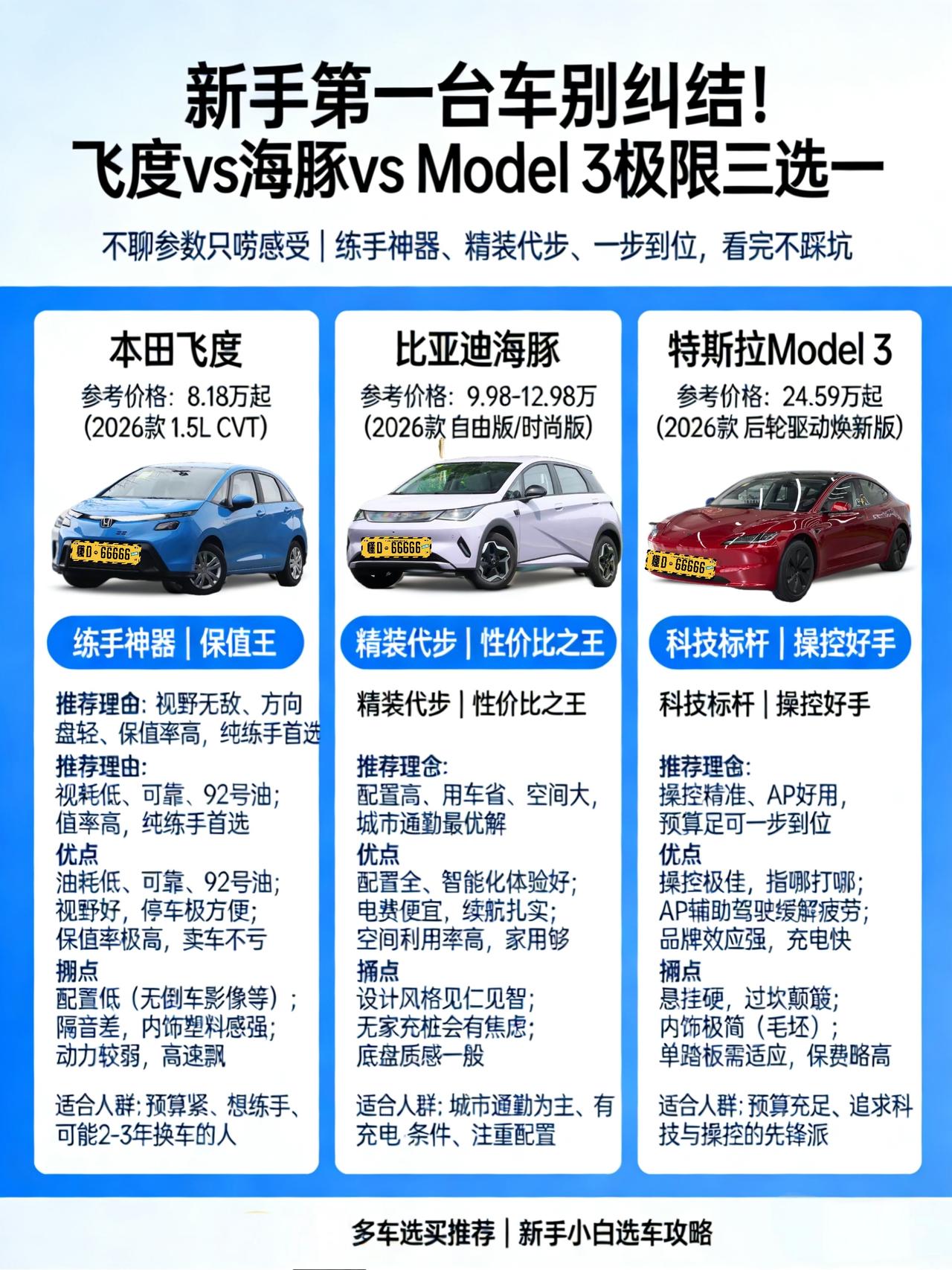 新手第一台车别纠结!飞度 vs 海豚 vs Model 3 极限三选一 看到好多刚拿本儿的朋友在纠结第一台车买啥,我就想起来我当年那股子迷茫劲儿了。预算就十来万,看啥都觉得好,又怕踩坑。今天不聊那些让人头晕的参数,就纯粹以我一个开了五六年车、换过两辆的“老萌新”角度,跟你们唠唠我心目中适合新手小白的几款“神车”,分别是本田飞度、比亚迪海豚和特斯拉Model 3。对,你没看错,我把Model 3也放进来了,理由后面说。 第一位:本田飞度——你的“毛坯房”教练车 为啥推荐飞度?就一个字:省心。这车简直就是为新手量身定做的“大型玩具车”。方向盘轻,油门刹车脚感线性,视野巨好,在市区里钻个空子、停个侧方位,那叫一个得心应手。它就像一个装修简单但格局绝佳的“毛坯房”,你能最直接地感受到驾驶本身是咋回事,建立起最初的车感。而且这玩意儿保值率吓人,开个一两年,技术练好了,想换车卖掉,亏不了几个钱,相当于低租金租了个陪练。 槽点嘛,就是内饰确实有点“素”,噪音大了点,配置低了点。但作为纯纯的、不掺杂质的入门燃油车,它给你的驾驶反馈是最真实、最练技术的。 适合人群:就想纯粹练手,对智能配置无感,追求极致省心省钱,并且可能一两年内就考虑换车的小伙伴。 第二位:比亚迪海豚——你的“精装小公寓” 如果你觉得飞度太“毛坯”,想要点现代生活的舒适和便利,那海豚绝对是十万级里的“六边形战士”。它是个电车,在市区里开,安静、顺滑、提速轻快,用车成本低到可以忽略不计。关键是,它的“精装修”到位啊!那个旋转大屏、好用的语音控制、以及各种实用的配置,让开车这事儿从“操作机械”变成了“享受科技便利”。对于新手来说,这些功能降低了上手难度,也增加了乐趣。空间利用上,海豚是魔术师,看着小,坐着挺宽敞。 个人认为最大的槽点可能是外观,那个设计风格你得能接受,喜欢的人爱死,不喜欢的觉得怪。还有就是,虽然支持快充,但如果你家里没法装充电桩,时不时得去找公共桩,还是会有点“电量焦虑”的。 适合人群:主要在城市活动,有固定车位或充电方便,喜欢科技感、注重用车成本和车内体验的新时代小白。 第三位:特斯拉Model 3——有点超纲的“未来样板间” 看到这你可能要拍桌子了:“预算十几万你推荐Model 3?” 别急,听我唠完。我把它放进来,是给那些预算其实能踮踮脚够到20多万,且对驾驶和科技有强烈好奇心的新手一个“一步到位”的参考选项。Model 3开起来的感觉,跟前面两位完全不同。它的方向盘重,底盘硬,指向极其精准,是一种非常“跟手”甚至有些“贼”的操控感。单踏板模式用习惯了是神器,能让驾驶变得极其简单和线性。这种极其电子化、直接化的操控逻辑,可能会重塑你对“开车”这件事的理解。而且它的智能驾驶辅助(AP),在环路和高速上,真的能大大缓解新手的紧张感。 但是! 它的槽点也很突出:内饰简约到“毛坯”,舒适性配置可能不如同价位国产车,底盘硬过坎颠,最重要的是,它需要你花时间去适应它独特的操作逻辑,不然一开始可能会手忙脚乱。 适合人群:预算相对充足,乐于接受新事物,享受科技感和直接操控感,并且主要在城市及良好路况行驶的“先锋派”新手。 唠在最后 所以你看,选车其实跟挑房子一个道理。飞度是练手艺的毛坯房,海豚是过日子的精装公寓,Model 3则是需要你适应但理念超前的未来样板间。 没有绝对的好坏,只有合不合适。我的建议是,别光看,一定要去开!去试试飞度的轻巧,感受下海豚的顺滑,再体验一把Model 3的“电门直给”。你的屁股和你的直觉,比任何参数表都靠谱。 第一台车,别追求完美,找到那个最能让你开着不紧张、甚至有点小快乐的车,就是最好的选择。毕竟,车是陪你看世界的伙伴,不是供在参数表里的神仙。 希望我这点唠唠能帮你拨开一点迷雾。也欢迎各位老司机在评论区聊聊,你当年第一台车是啥,后悔不?【来自懂车帝车友圈】