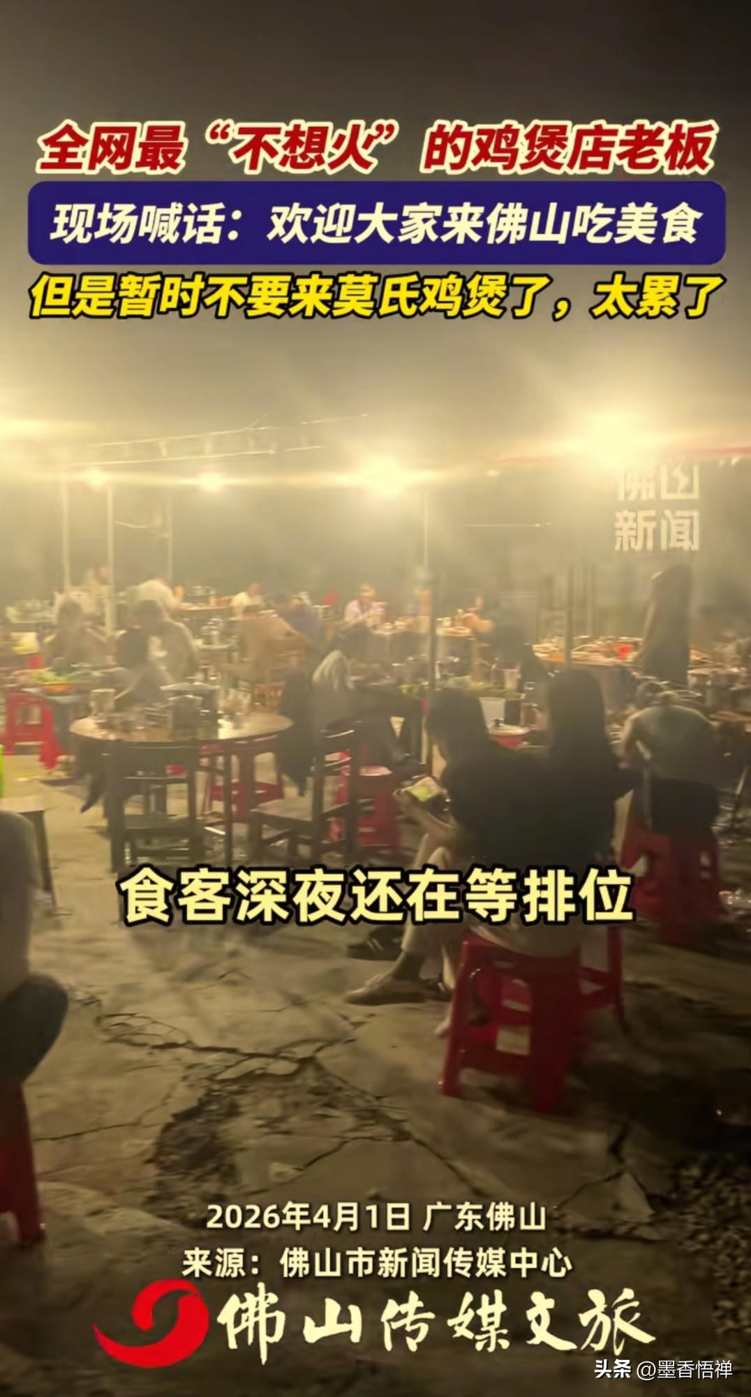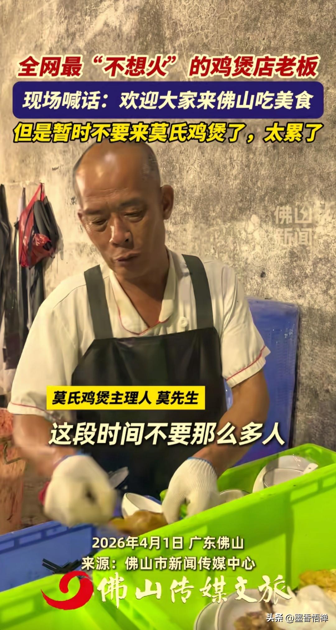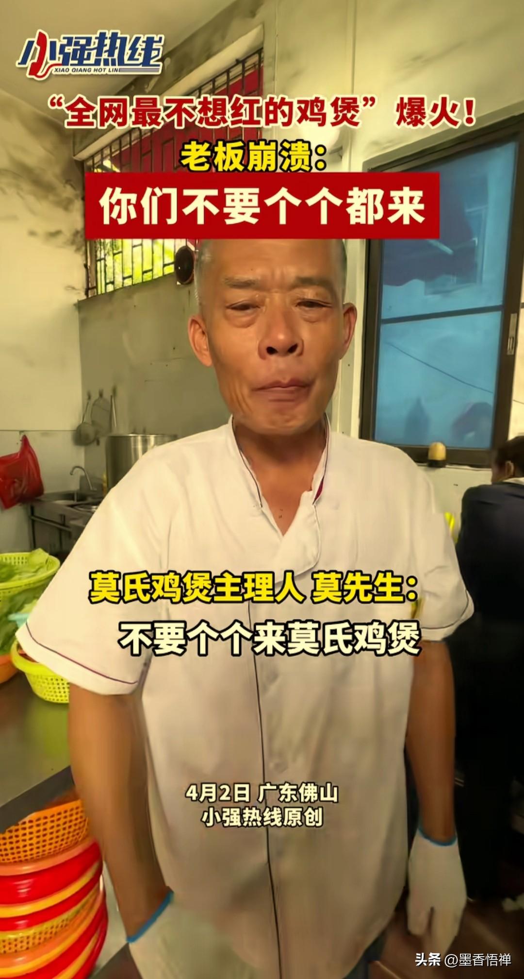 佛山鸡煲店老板哭着赶客:别来了!我真杀不动了! 最近广东佛山顺德区一家鸡煲店火得离谱,老板却一点都不高兴,反而累到崩溃,对着排队的人连连求饶:求你们别来了,我真干不动了! 本来就是一家小馆子,老板夫妻俩加个外甥,一天也就卖十来只鸡,安安稳稳过日子。 事情的起因是:有个网红探店博主,发现一家偏僻的鸡煲店,进去就看见老板在外面悠闲喝茶,店里还贴了个温馨提示:在本店进餐,喝了汤可能会拉肚子,这属正常。 博主问:那吃了就是我的问题?老板说:反正不是我的问题。老板看见博主拍视频,特意叮嘱:拍的时候别说太好,别吹牛,别把人都搞过来了。 谁能想到视频一发直接爆火,网友们疯了一样来打卡,一天涌来几百桌。老板从早上6点半起床忙到深夜,中午连饭都顾不上吃,打扫完卫生就到凌晨2点了。 鸡杀不完,菜上不及,老板手烫得全是泡,老婆嗓子喊哑,临时雇的人干一天就跑了。老板实在顶不住,对着镜头喊话:欢迎大家来佛山,但这段时间别来我这儿了,太累了,周边好吃的也不少。 更绝的是,老板还专门开了小号在评论区黑自家店:“踩雷!好难吃的鸡,太柴了,一只鸡三百多,坐一下强制消费三百多。”结果被网友扒出来,这就是老板让侄子弄的号,就是想让食客别来,自己能歇口气。 别人削尖脑袋求流量,他拼了命怕流量砸过来。不是不想赚钱,是小本生意接不住这么大的热闹,一赶工期,味道就变,几十年的招牌就砸了。 他还跟客人说味道一般,别跟风。不忽悠、不包装、不搞人设,就想安安静静做个小生意。 这世上多的是想红的人,难得有个只想踏实过日子、不想被流量绑架的老板。 热闹是别人的,他只想要一觉睡到自然醒。 你说这老板,是不是全网最实在的?