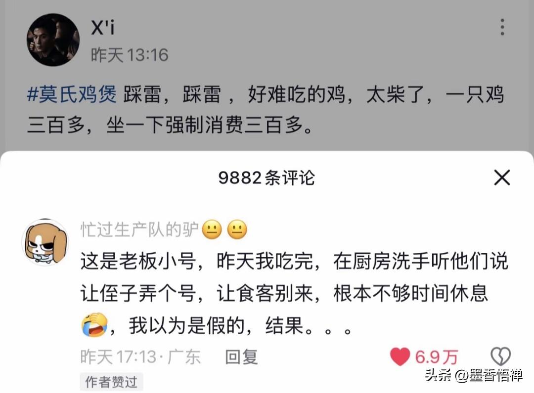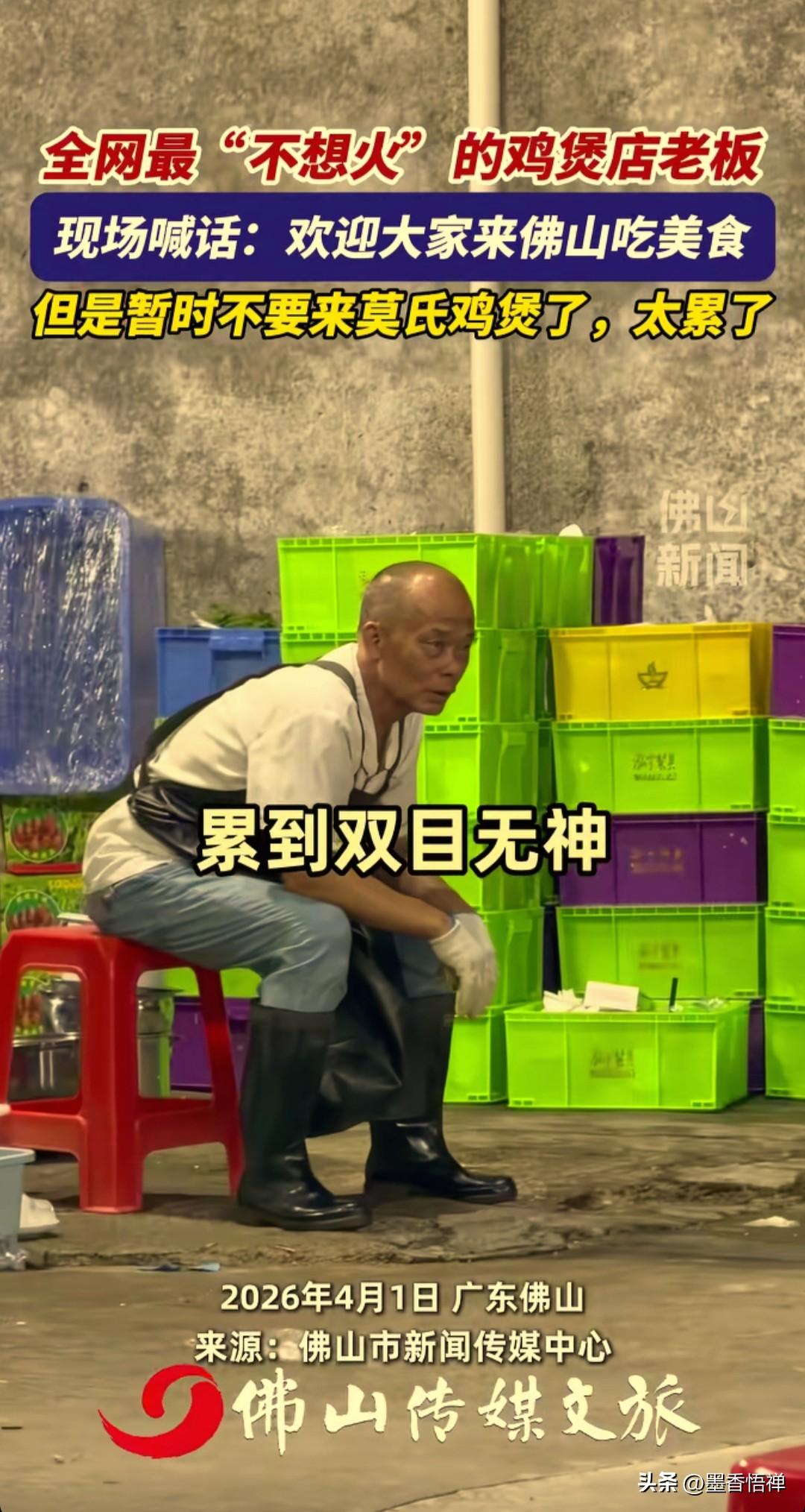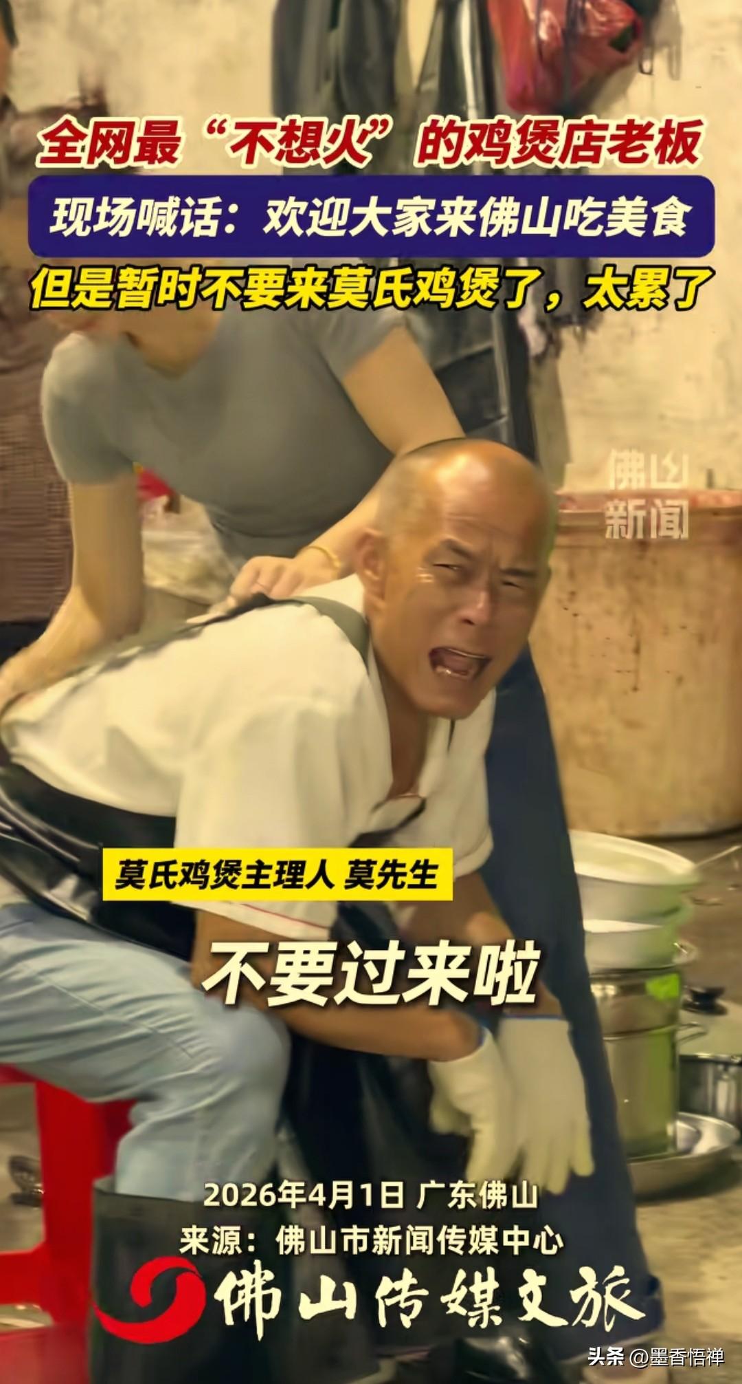 佛山鸡煲店老板哭着赶客:别来了!我真杀不动了! 最近广东佛山顺德区一家鸡煲店火得离谱,老板却一点都不高兴,反而累到崩溃,对着排队的人连连求饶:求你们别来了,我真干不动了! 本来就是一家小馆子,老板夫妻俩加个外甥,一天也就卖十来只鸡,安安稳稳过日子。 事情的起因是:有个网红探店博主,发现一家偏僻的鸡煲店,进去就看见老板在外面悠闲喝茶,店里还贴了个温馨提示:在本店进餐,喝了汤可能会拉肚子,这属正常。 博主问:那吃了就是我的问题?老板说:反正不是我的问题。老板看见博主拍视频,特意叮嘱:拍的时候别说太好,别吹牛,别把人都搞过来了。 谁能想到视频一发直接爆火,网友们疯了一样来打卡,一天涌来几百桌。老板从早上6点半起床忙到深夜,中午连饭都顾不上吃,打扫完卫生就到凌晨2点了。 鸡杀不完,菜上不及,老板手烫得全是泡,老婆嗓子喊哑,临时雇的人干一天就跑了。老板实在顶不住,对着镜头喊话:欢迎大家来佛山,但这段时间别来我这儿了,太累了,周边好吃的也不少。 更绝的是,老板还专门开了小号在评论区黑自家店:“踩雷!好难吃的鸡,太柴了,一只鸡三百多,坐一下强制消费三百多。”结果被网友扒出来,这就是老板让侄子弄的号,就是想让食客别来,自己能歇口气。 别人削尖脑袋求流量,他拼了命怕流量砸过来。不是不想赚钱,是小本生意接不住这么大的热闹,一赶工期,味道就变,几十年的招牌就砸了。 他还跟客人说味道一般,别跟风。不忽悠、不包装、不搞人设,就想安安静静做个小生意。 这世上多的是想红的人,难得有个只想踏实过日子、不想被流量绑架的老板。 热闹是别人的,他只想要一觉睡到自然醒。 你说这老板,是不是全网最实在的?