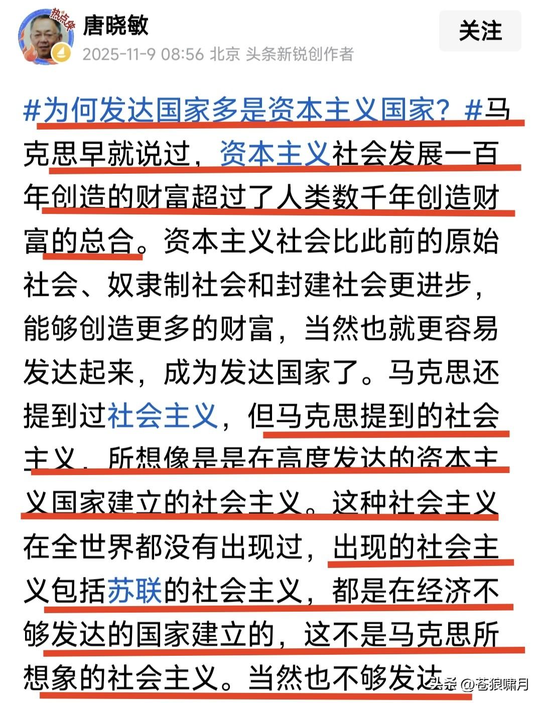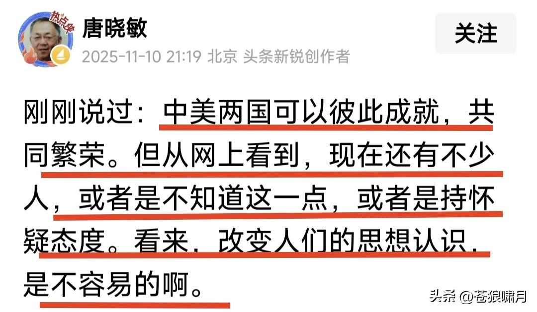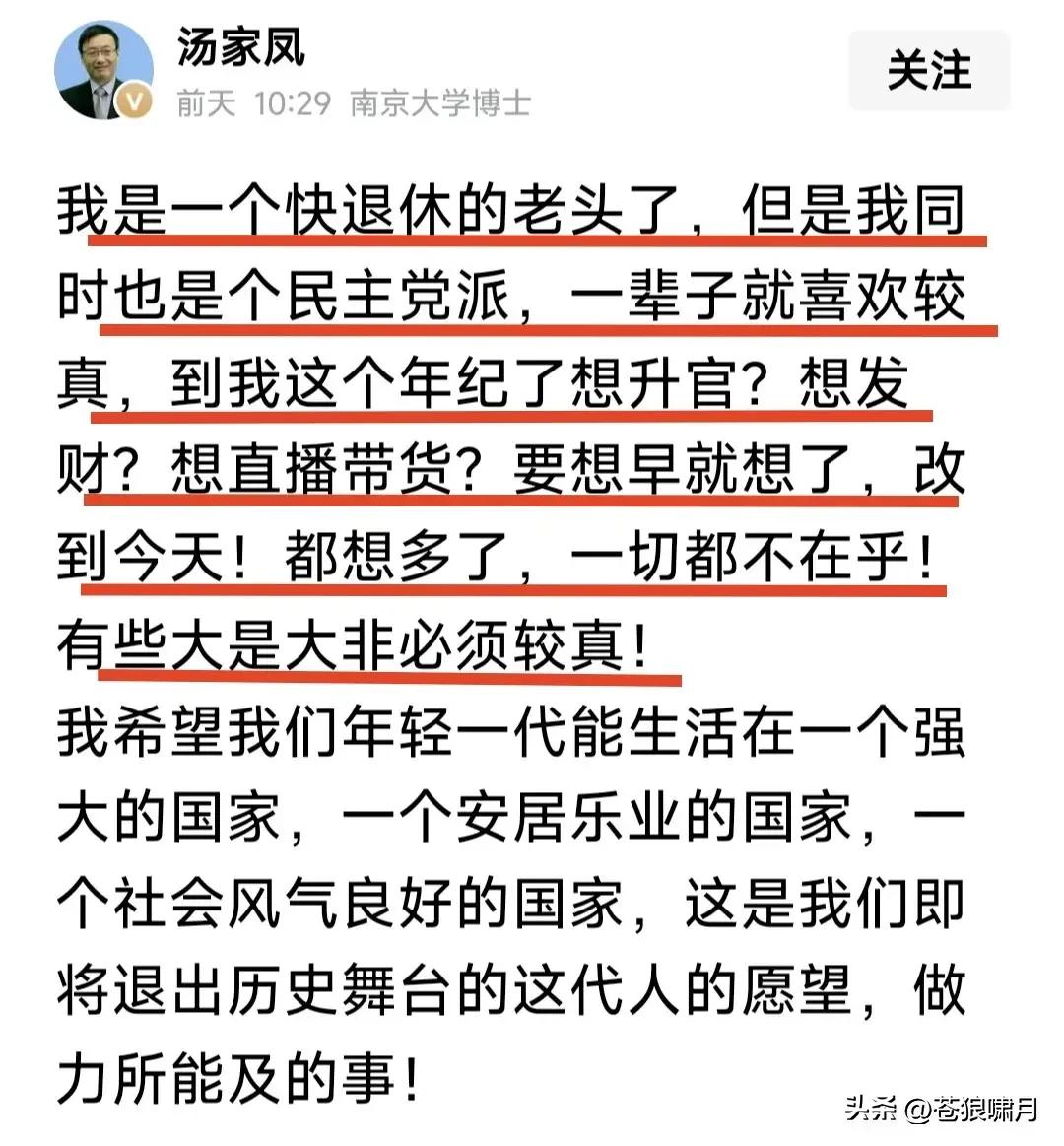 都是“非著名教授”,黄教授与唐教授及汤教授之间的差别,咋这么大呢? 苍狼列举三位“非著名教授”几个文案,请网友赏玩品读,能读出差别吗? 1.黄教授:中国移民都去哪了? 飞艇追打F-35,这是美国被痛打? 听说牢A要出书,粉丝要支持购买啊! 2.唐教授:中美可互相成就,共同繁荣。 苏联是中国威胁,解体中国受益最大。 资本主义发展一百年,创造财富超过人类千年创造总和。这是马克思说的。 3.汤教授:媒体为何不提美国斩杀线,三通一达,社会名人爱去的“那个岛”? 为何把公交车广告“贞洁”说成糟粕? 他不想当官,不想发财,不直播带货!只是对有些大是大非问题爱较真! 苍狼对三位“非著名教授”评几句: 1.黄教授正年轻,事情多没精力,坐不下来写长文,三言两语说事情,言简意赅道理明,一切尽在不言中! 2.唐教授:已退休有时间,闲时头条写着玩!读书破万卷,站位高深远,理性爱中华,为国提建议。有水平! 3.汤教授:临退未退,心情放松。真心爱国,关注热点,不惧权威敢批评!观念有点陈旧,不知教的何专业? 以上短评对不对?欢迎网友批评! …………