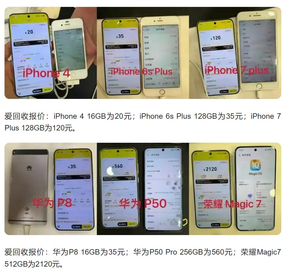 正规平台(爱回收、转转):iPhone4回收价仅20元,iPhone6sPlus报价35元,华为P8报价35元;无法开机的报废机,多数平台直接拒收,个别线下商家报价仅10元/台。