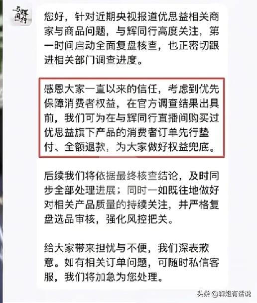 与辉同行深夜道歉了 前几天曝出与辉同行卖假洋货,我那天刚回家,公公给我说“你不要在董小伙的直播间买东西了,假的……” 说实话,当时很诧异,我平常忙,不太关心新闻,只是偶尔晚上刷一刷,退休的公婆天天刷手机,他们家事国事天下事,事事关心。 作为与辉同行两年的老粉,我相信他们选品严格,质量可靠,所以家里小一半的东西来自他的直播间,下单的初衷出于对宇辉人品的认可。 买到的大部分货品还可以,质量靠谱,这次翻车是意外之举,但有点小失望。 一觉醒来看到宇辉团队向所有的顾客致歉,便承诺全额退款,心里又泛起了欣喜,宇辉还是有担当的。 全额退款,不是每个商家都能做到,态度诚恳,没有回避问题,符合董宇辉的性格。 年轻人走点弯路是正常的,这次事件应该让他会反思,团队以后的选品会更加严格吧 相对来说,他的直播间,算是靠谱的电商平台,不能一棒子打死,我本人还是会一如既往的支持。 同时这个事也让我反思,今后网络购物要更加慎重,要理性看待文化带货,网红带货。 商品就是商品,不要与情怀挂钩,网上买东西就认准一条,“安全实用”才是惟 一标准。