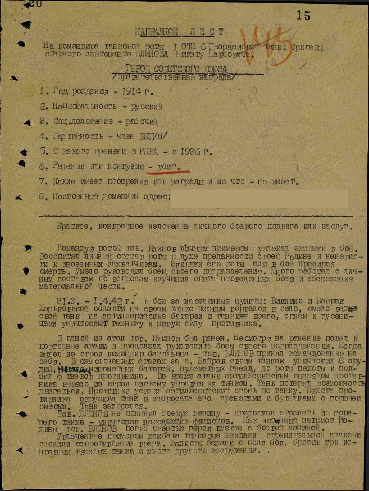 1942 年 4 月 2 日,中尉尼基塔・帕夫洛维奇・布利诺夫在燃烧的坦克中继续向敌军射击,与战车一同壮烈牺牲,次日本是他 28 岁生日。在拜拉克村的激战中,他指挥坦克击毁 8 门火炮、多门迫击炮与机枪阵地,歼灭近一个步兵连,击毁 6 辆敌军坦克。坦克被炮火击中失去机动后,遭德军包围并纵火。布利诺夫拒不撤离,在烈火中坚持战斗直至牺牲。战后战友在其坦克周围发现近 60 具德军尸体,他以生命践行了对祖国的忠诚。